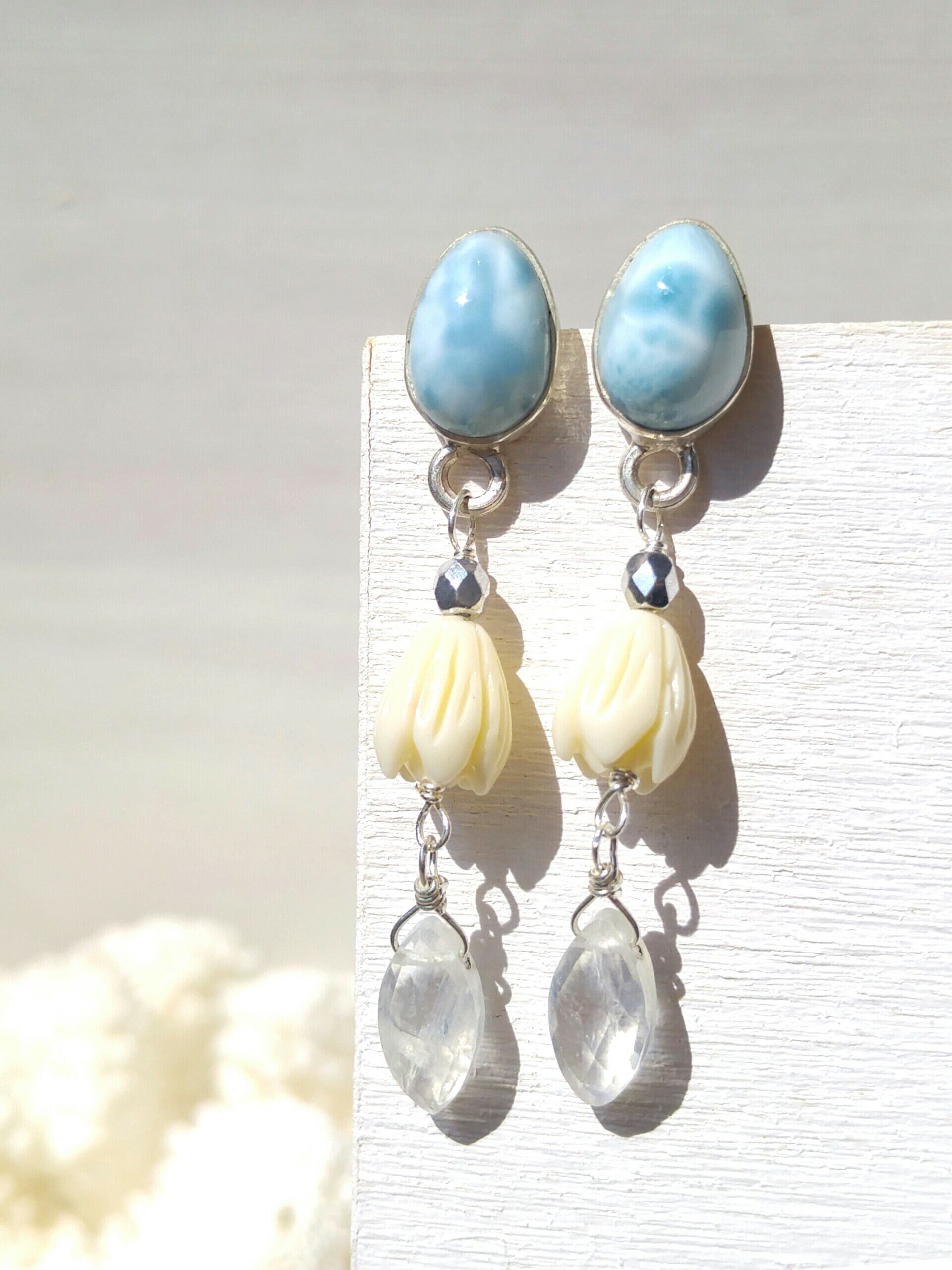 ドミニカ共和国直輸入の美しいハイクラス雫ラリマー、ヴィンテージピカケ、宝石質レインボームーンストーンを使った