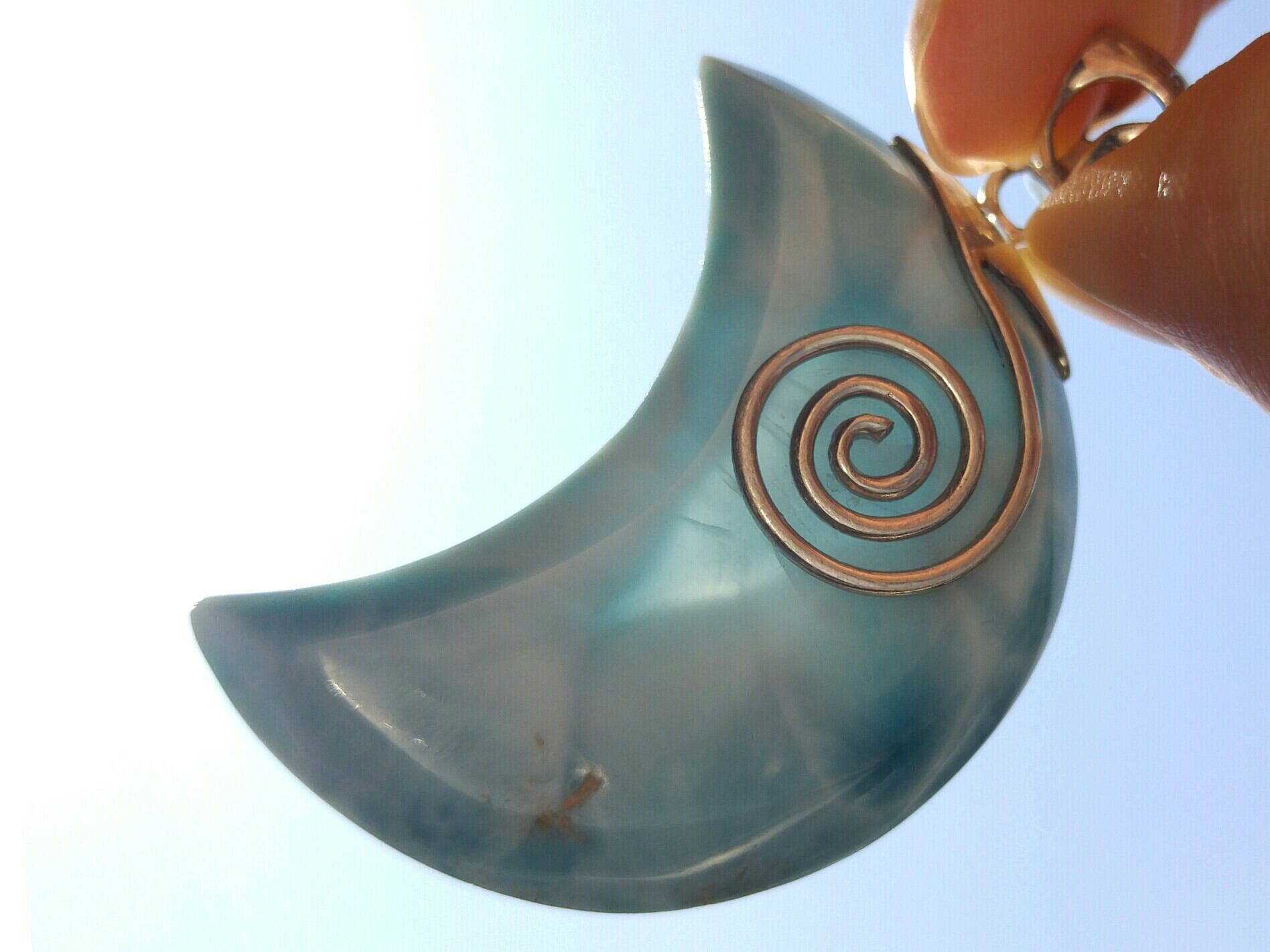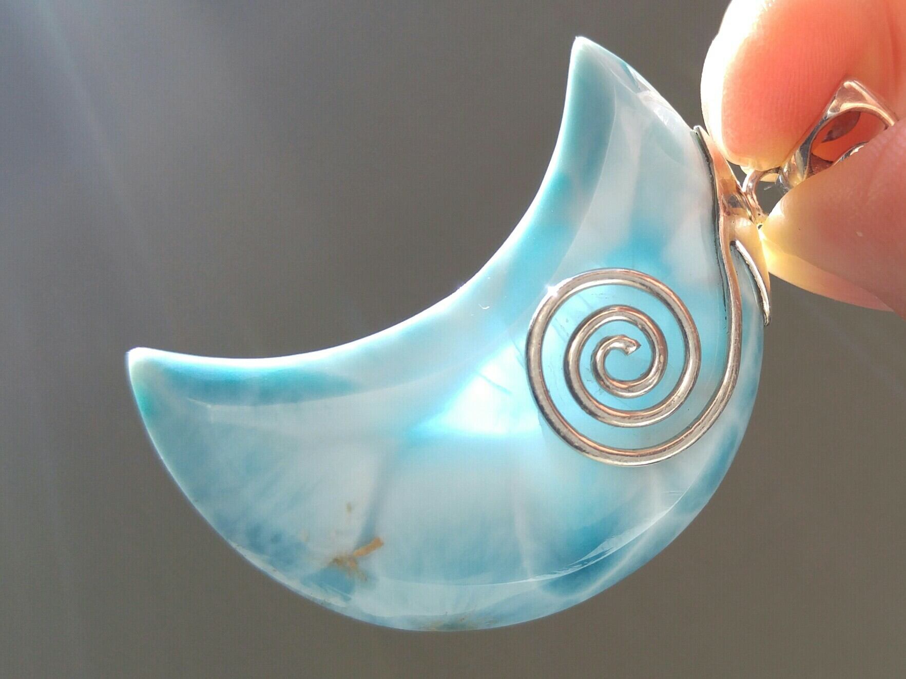 透き通る美しさ、煌めくシャトヤンシー、青い波模様、バランス良く混ざった美しいドミニカ共和国直輸入のハイクオリティラリマーを使った唯一無二の物凄く美しいお月様ペンダントトップです。
