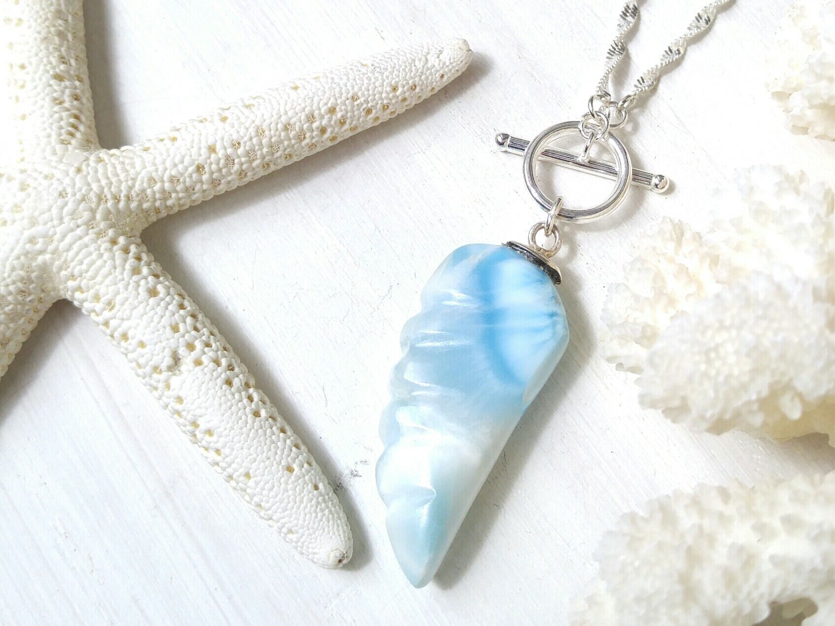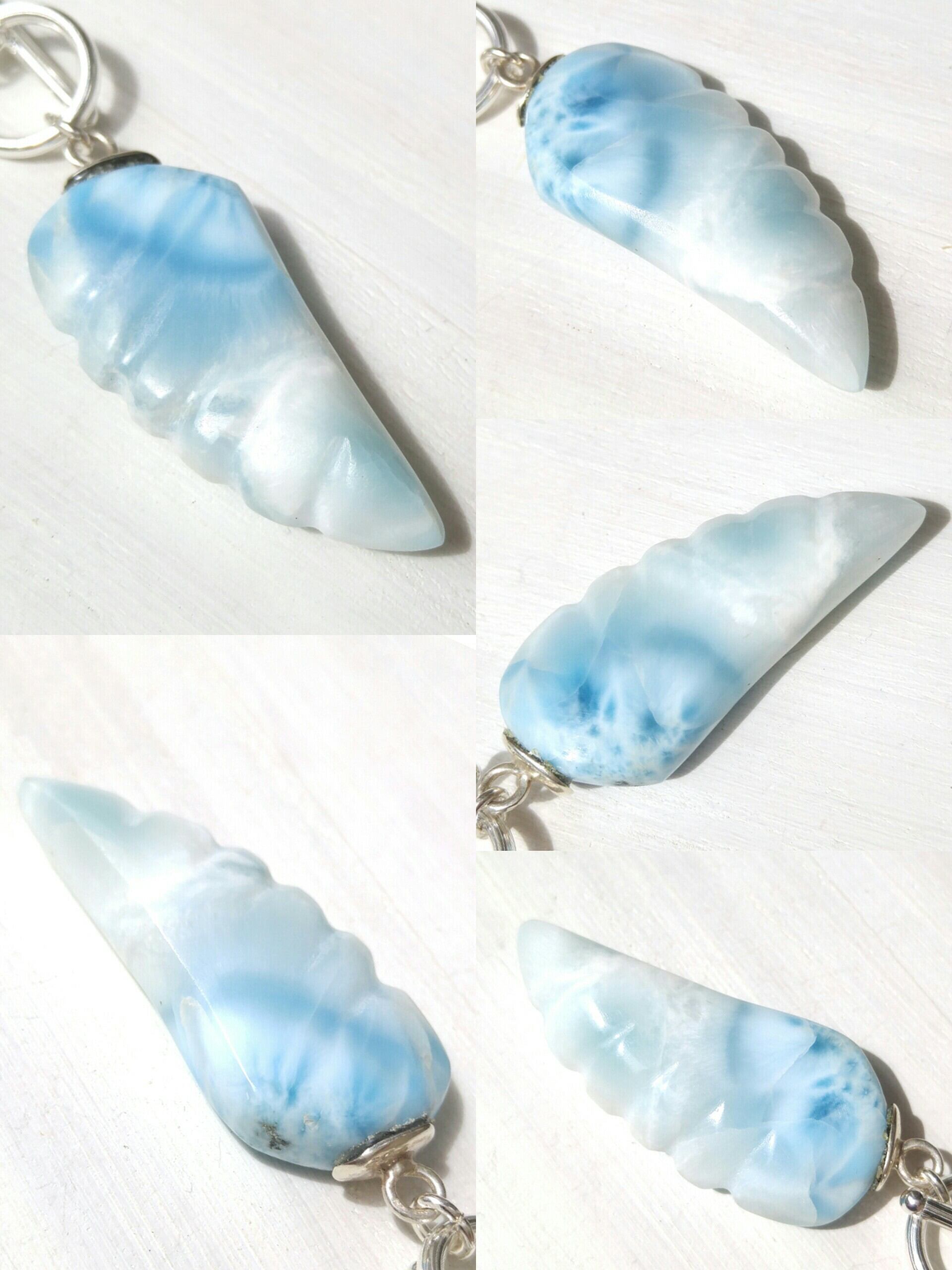 透明感があり、ブルー&ホワイトの2層が美しいドミニカ共和国直輸入のシーブルーのハイクラスラリマーを使った羽のネックレスです。