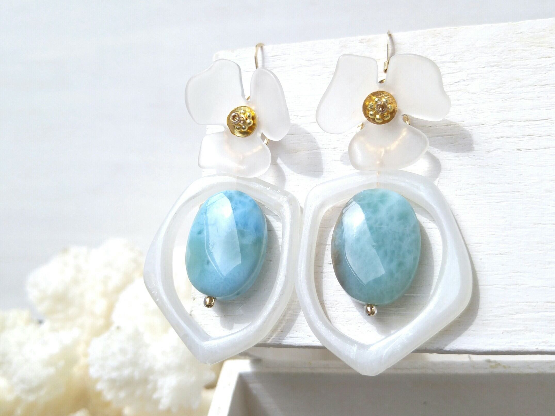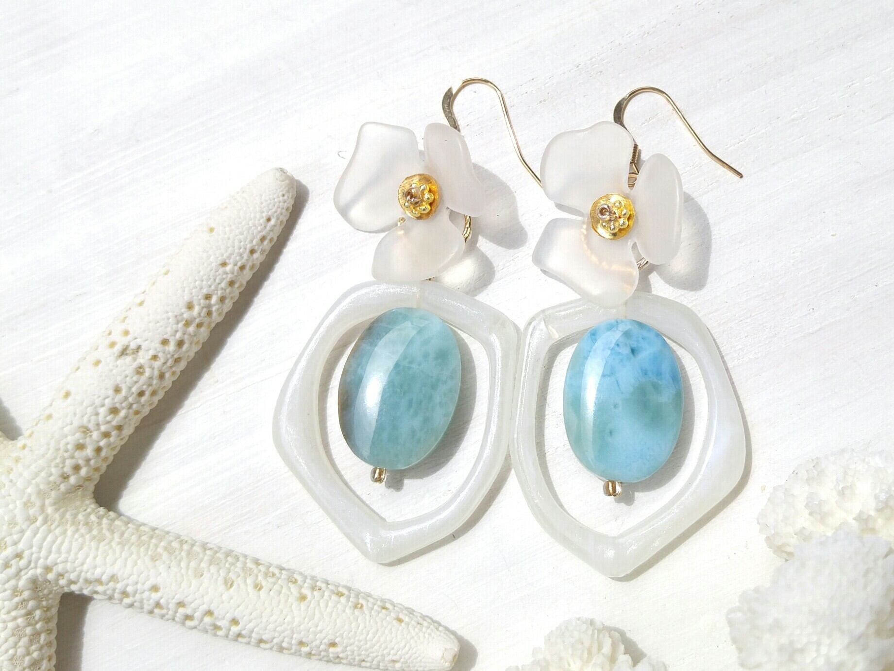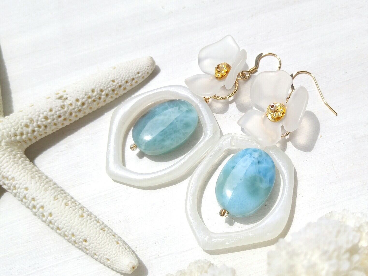 海辺の大きな花の耳飾り(14kgf)‐軽い♪個性的な可愛い大きなラリマー&マットクリアホワイトの花&ホワイト変形リング 大人可愛いボリュームピアス-