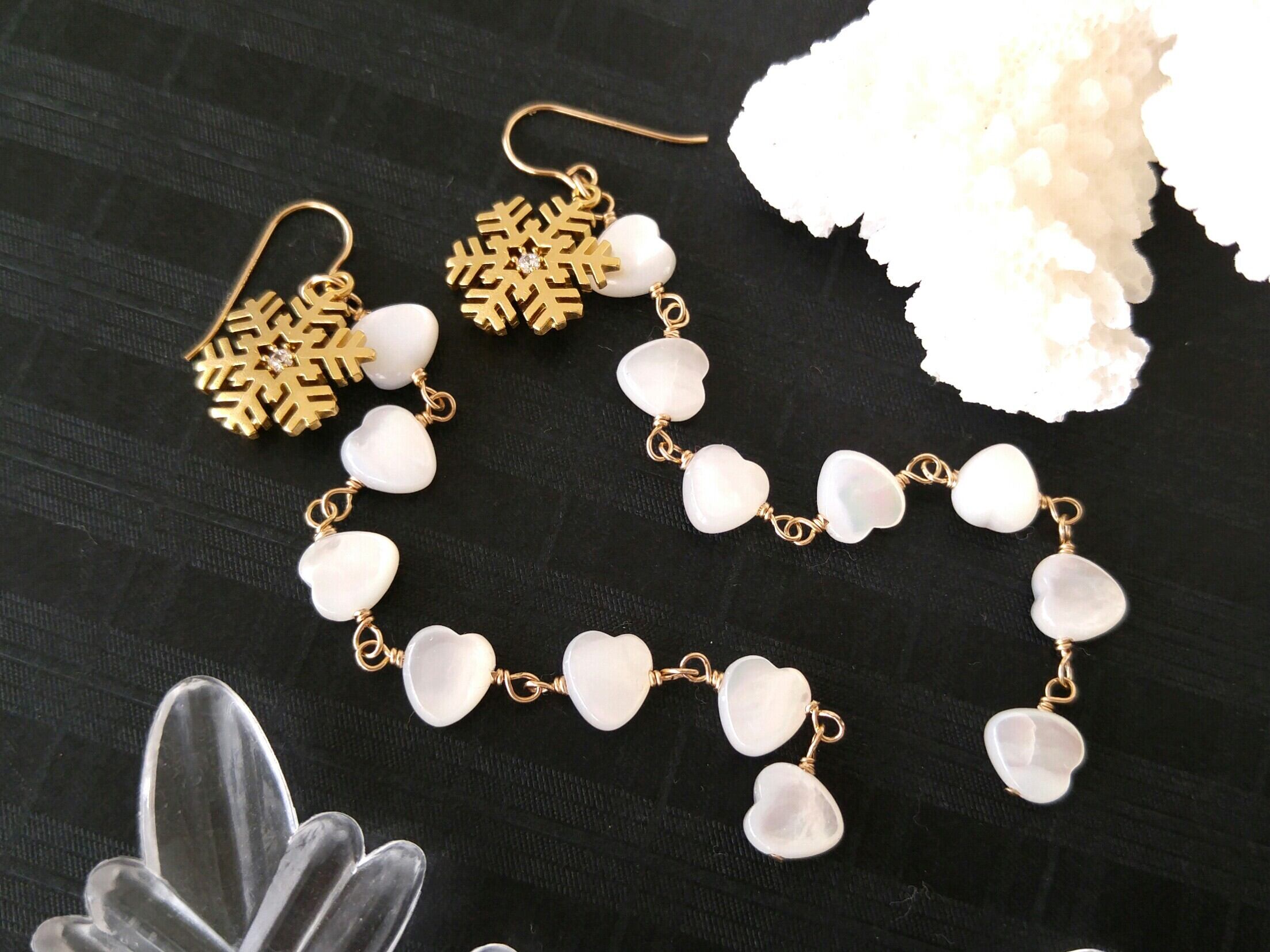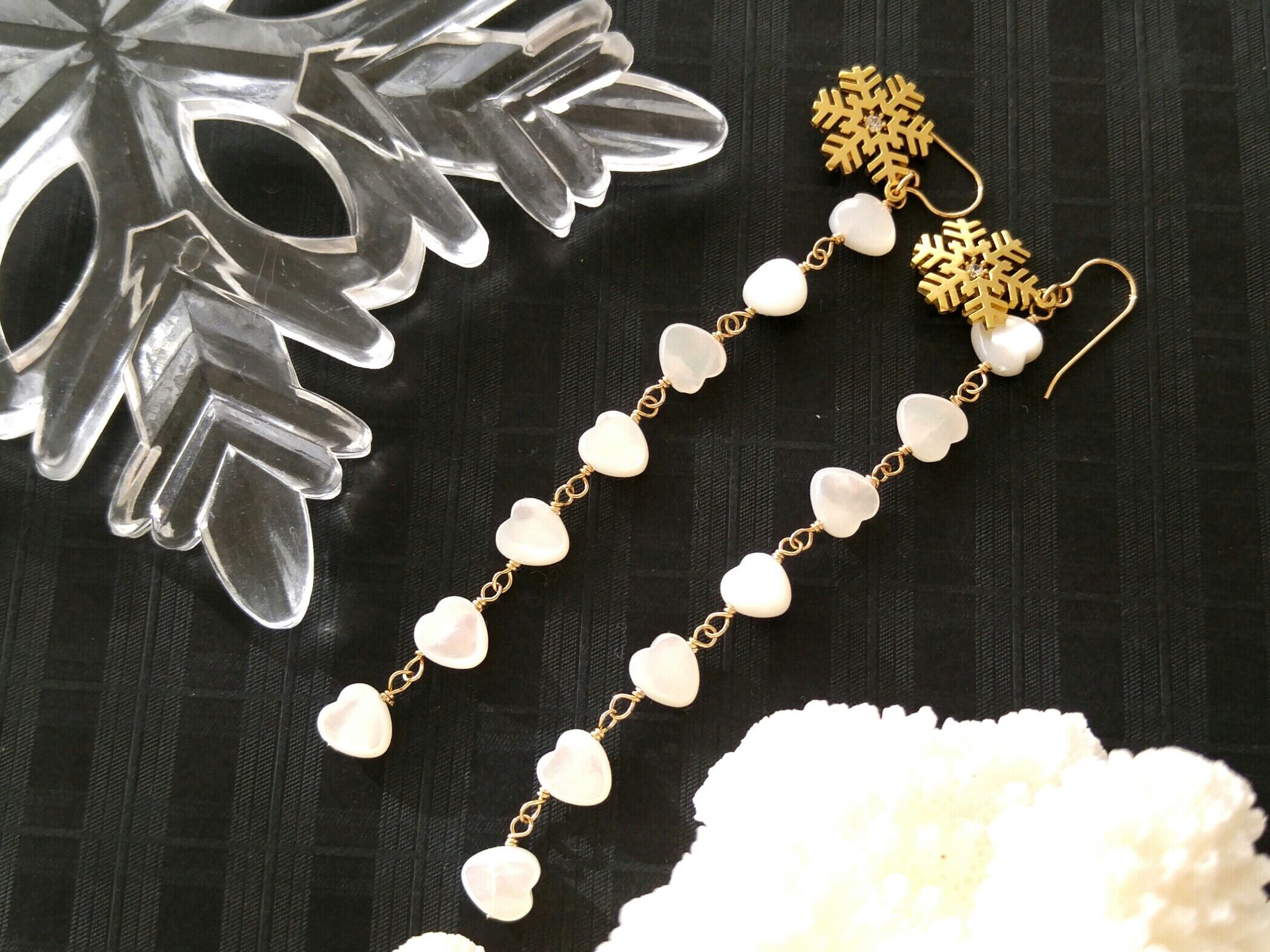 マザーオブパールの可愛いハート、マットゴールドの落ち着いたスノーフレークを使った