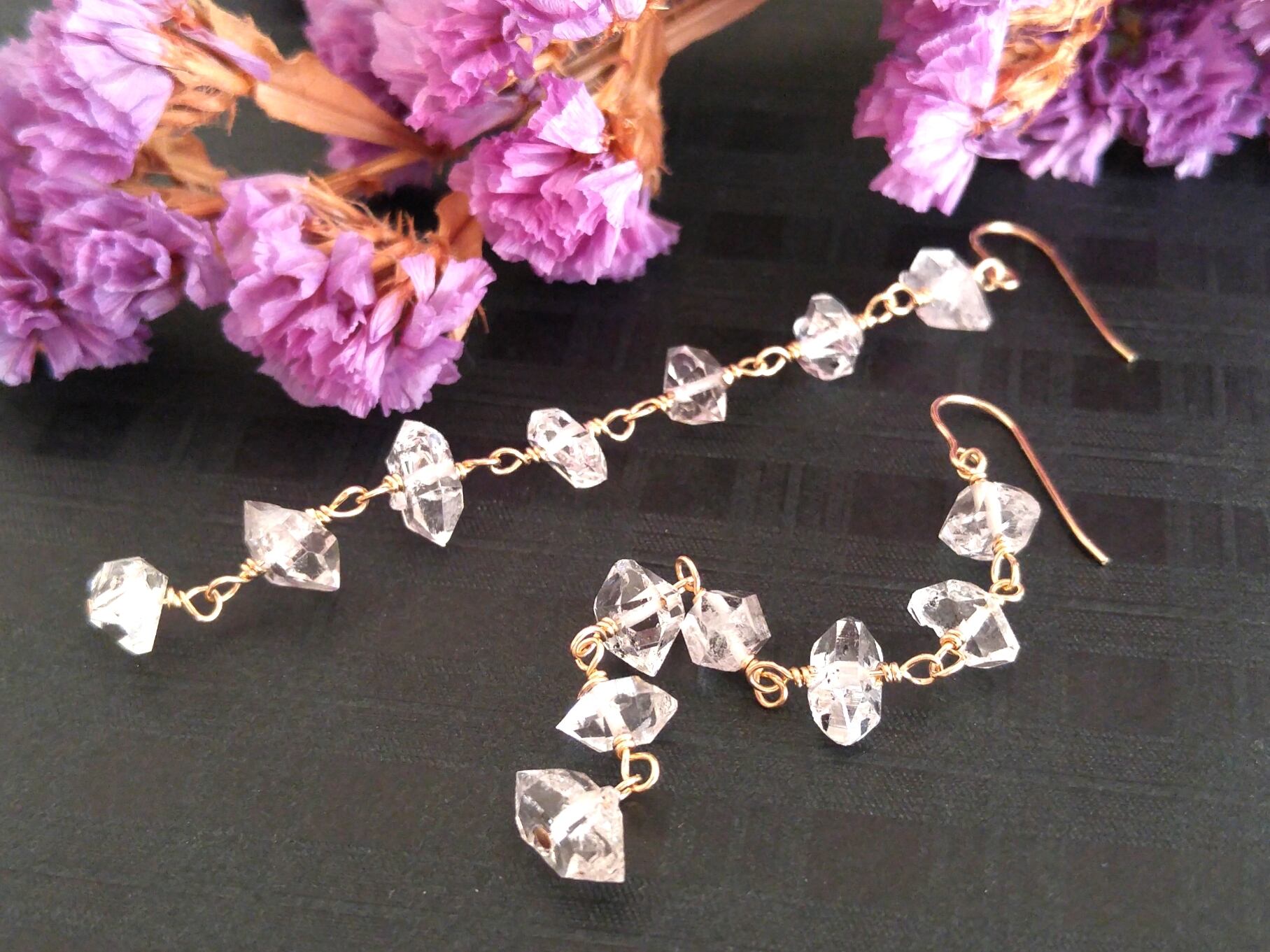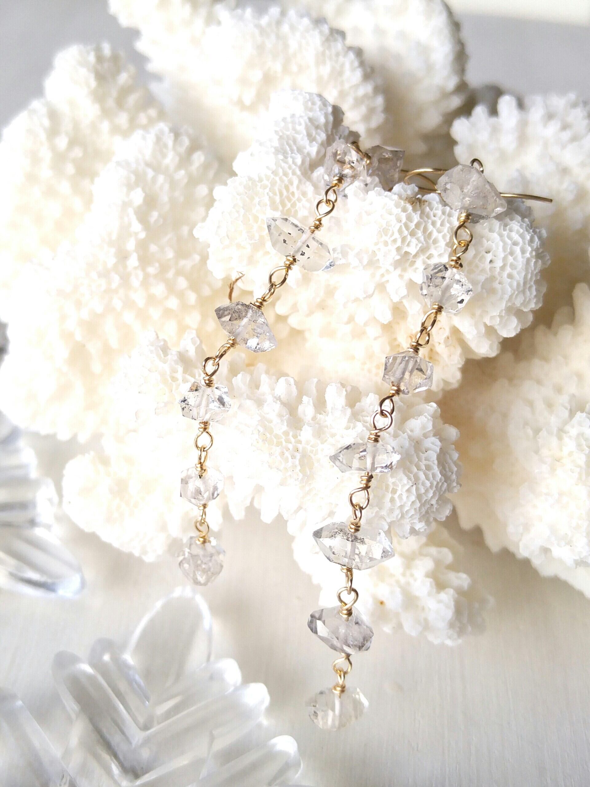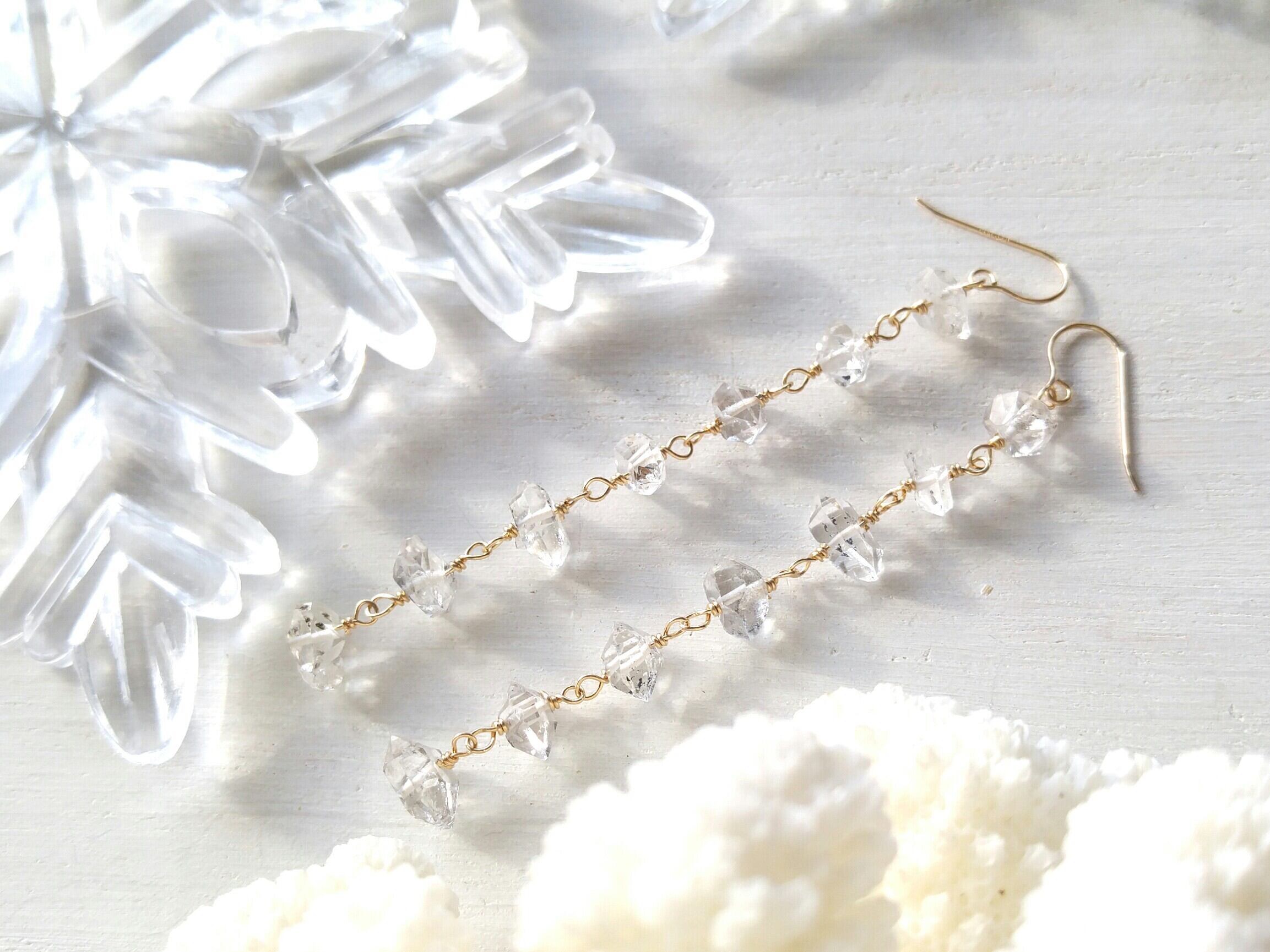 キラキラ美しいハーキマーダイヤモンドをそれぞれに7粒、両耳で14粒ずつも使った