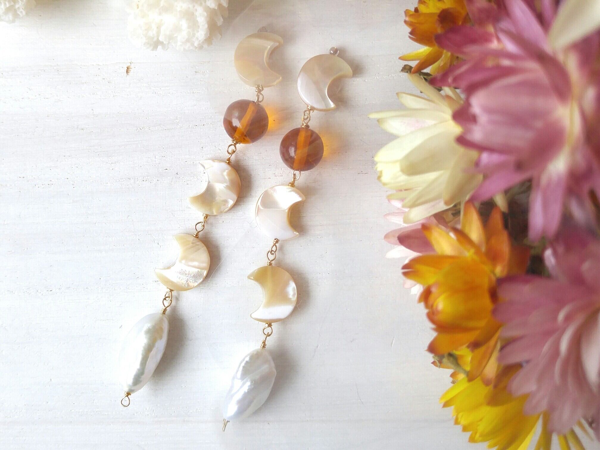 ドミニカ共和国産のこっくりとした色が本当に美しい天然アンバー、優しい煌めきが美しいシェルのお月様、大粒の涙のようなバロックパールを使った