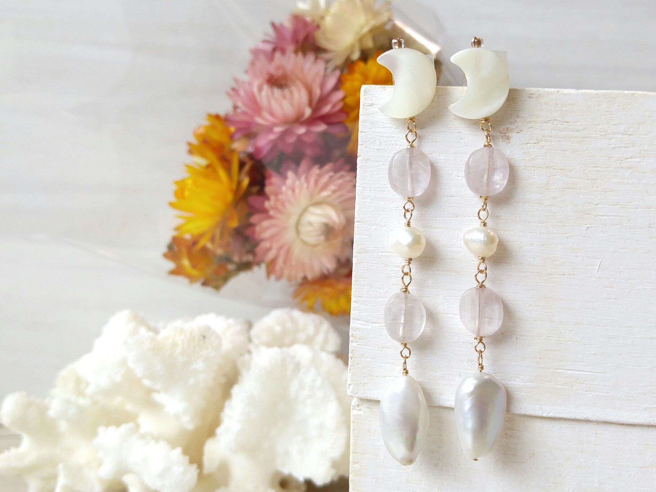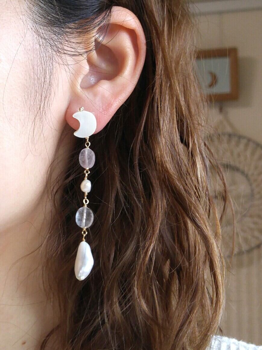 ♡月の涙♡(14kgf)−大粒パール&透明感抜群のクンツァイト&シェルのお月様&淡水パール