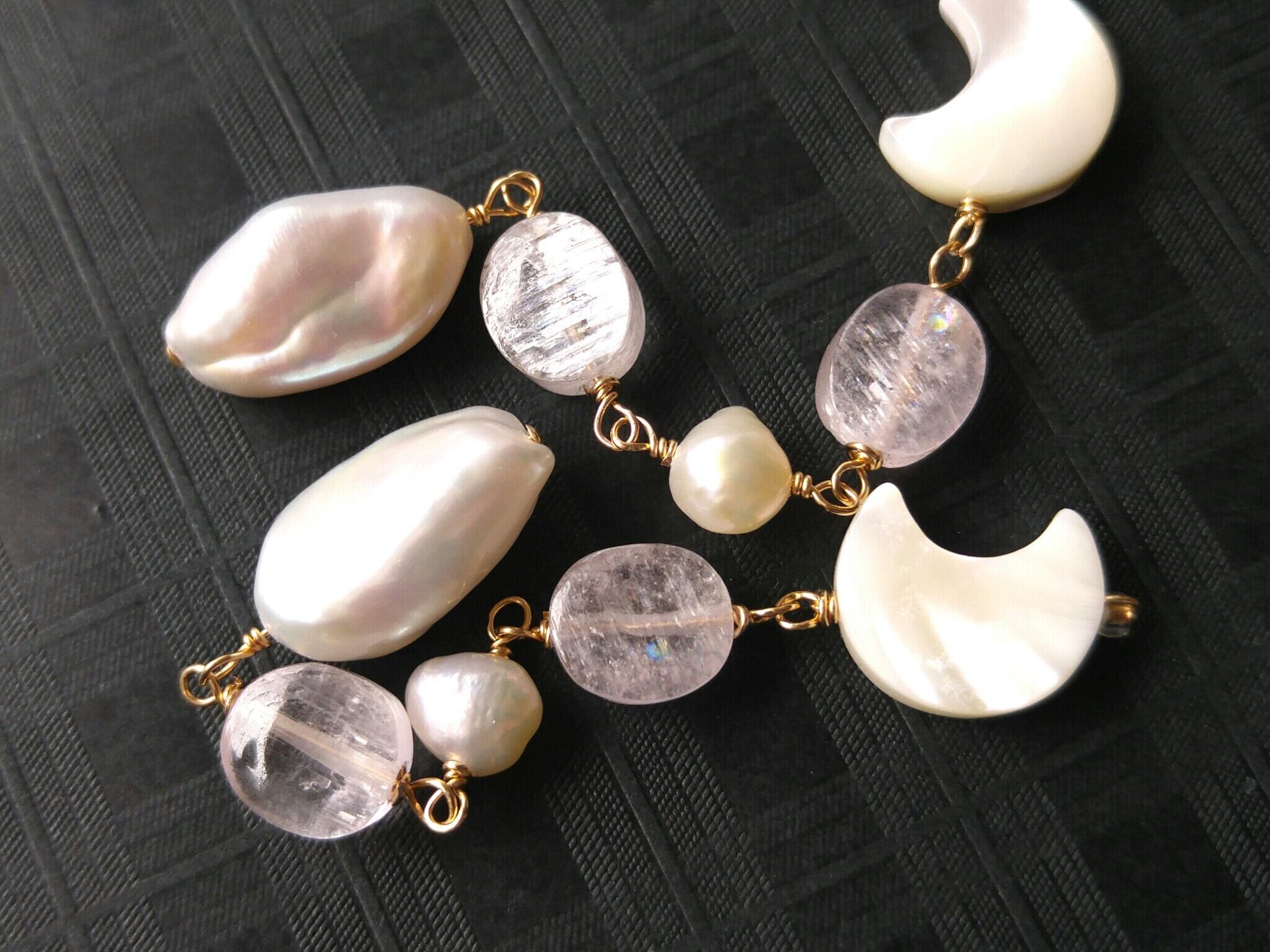 透明感抜群の宝石質の美しいクンツァイト、大粒のAAAバロックパール、シェルのお月様、淡水パールを使った