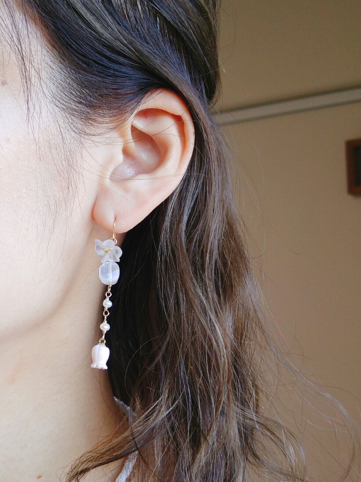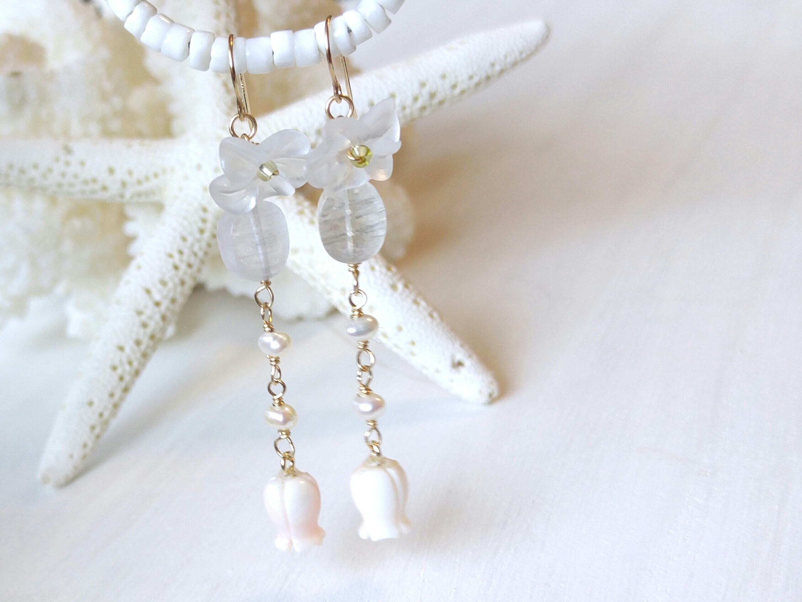 クィーンコンクシェルの鈴蘭、クンツァイト、淡水パール、氷のような花を使った