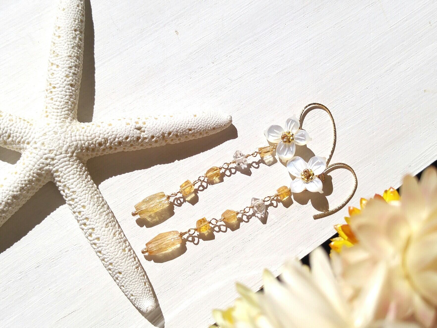 Honey&Flower耳飾り(14kgf)−美しいインペリアルトパーズ&可愛いシェルフラワー&ハーキマーダイヤモンドー
