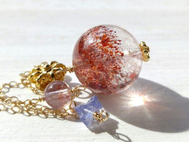 キラキラと美しい濃い赤の大粒ハイクオリティのレピドクロサイトインクォーツ(レッドスーパーセブン)、ゲーサイトインアメジスト、宝石質レインボームーンストーン、タンザナイト原石をあしらったキラキラと綺麗な陽だまりネックレスです。