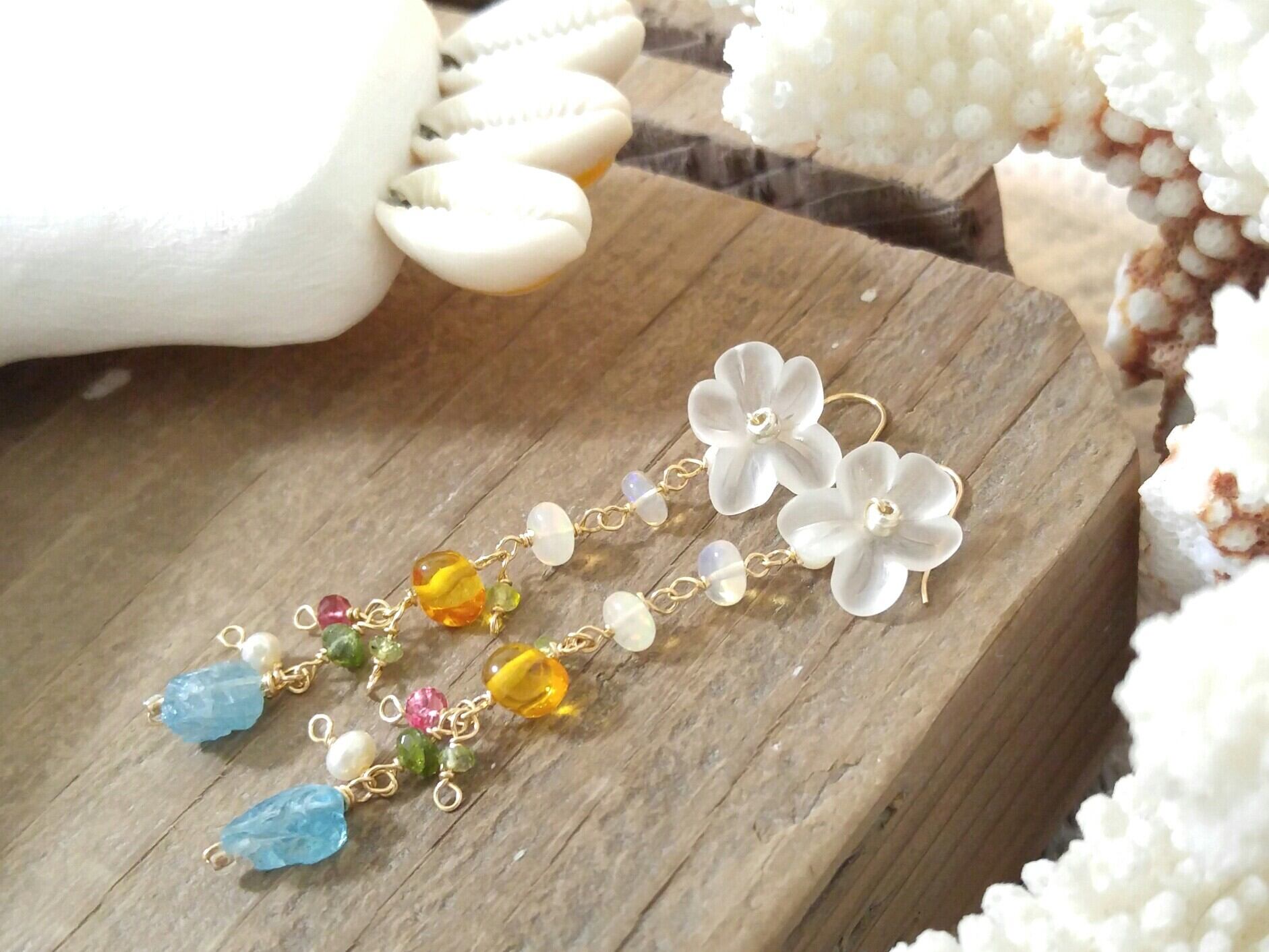 ♡Tropical&Rainbow♡14kgf−ビタミンカラーの天然石たち&可愛いフラワー 大人可愛いロングピアスー