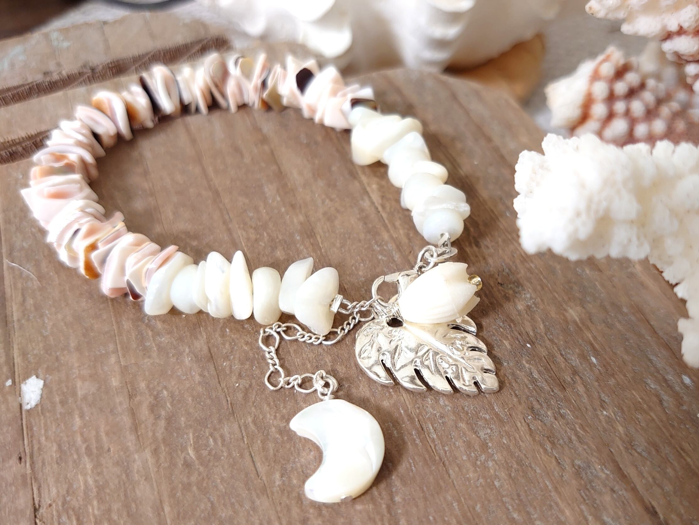 淡く可愛いピンクシェル、シルバーモンステラ、ピカケの花、マザーオブパール、シェルのお月様チャームを使った