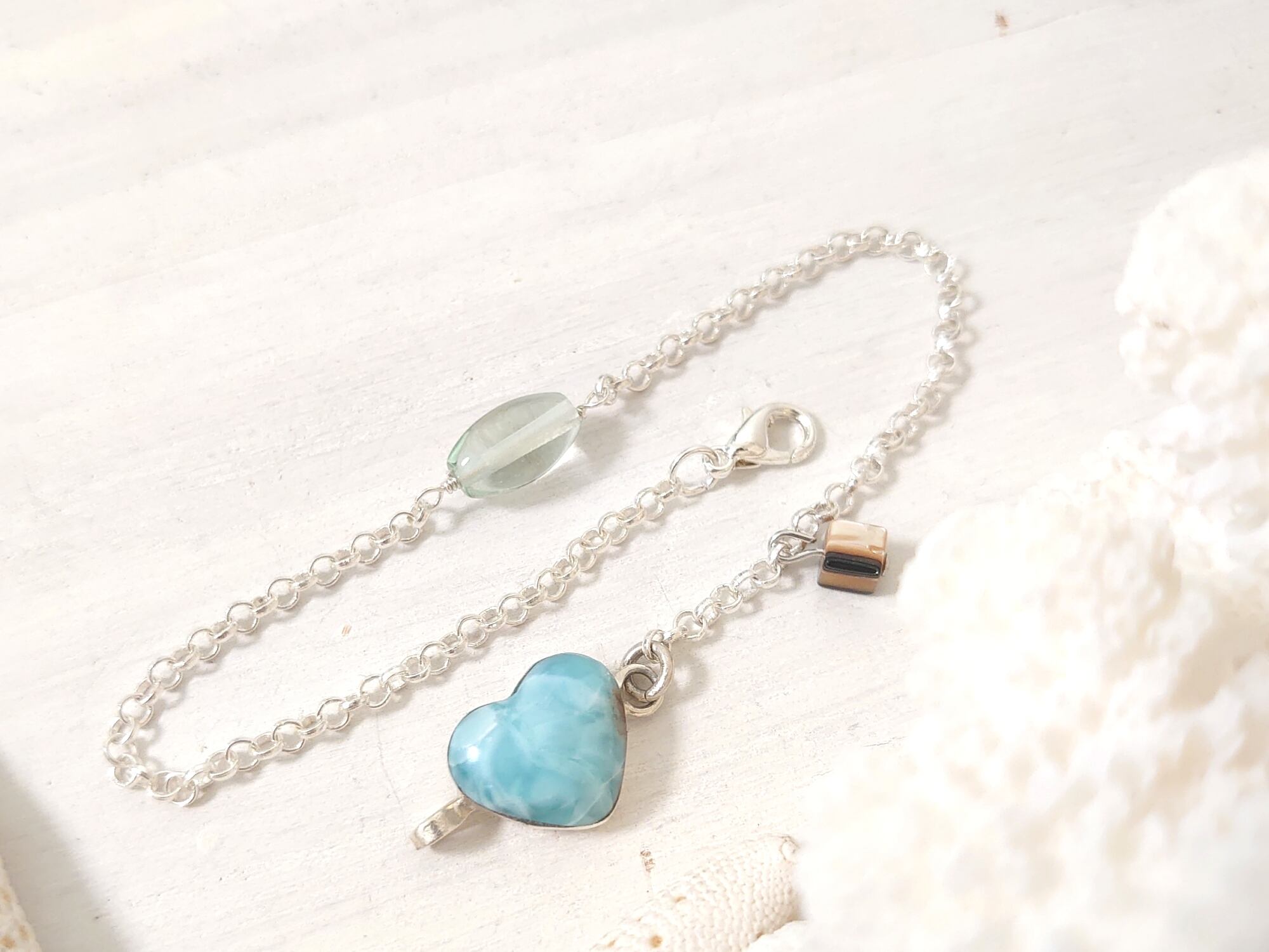 海の欠片のようなドミニカ共和国直輸入のレアなレッドラリマー入りの可愛いハートラリマー、透明感バッチリのフローライト、大人カラーのアバロンシェルを使った
