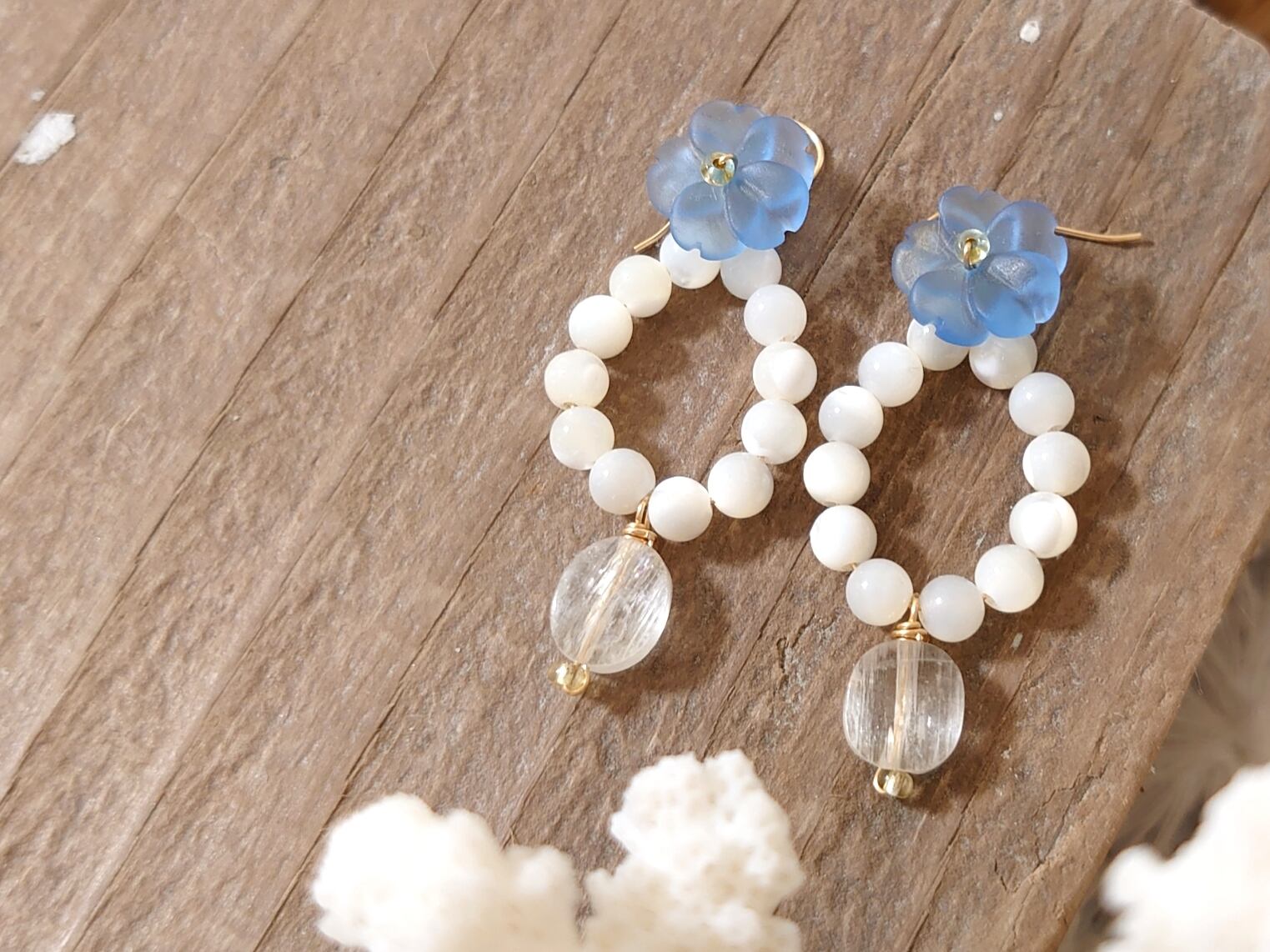 透ける半透明のブルーの花、シラーが煌めくクンツァイト、マザーオブパールを使った