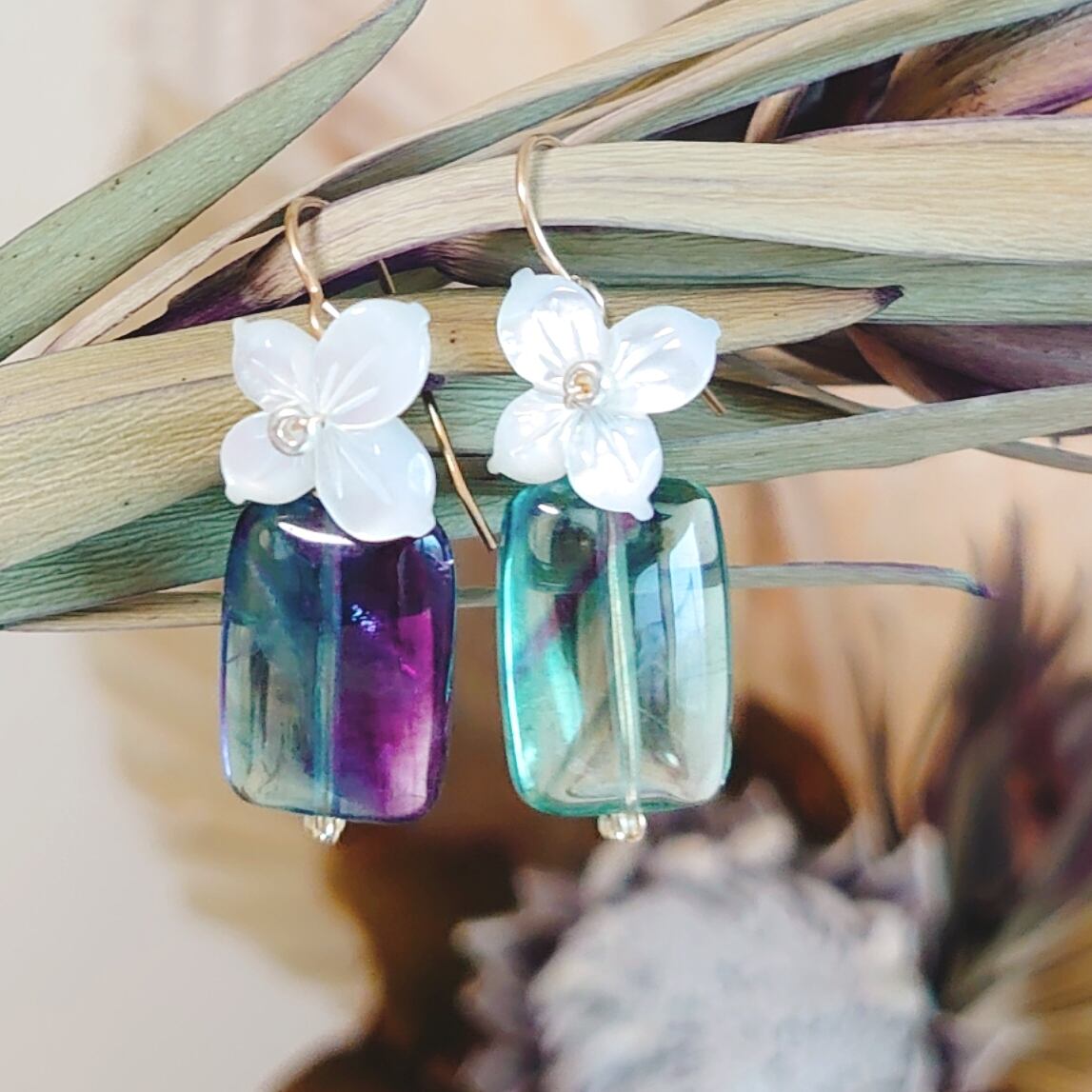 みずみずしい大粒フローライト、煌めきが美しいホワイトシェルの花を使った