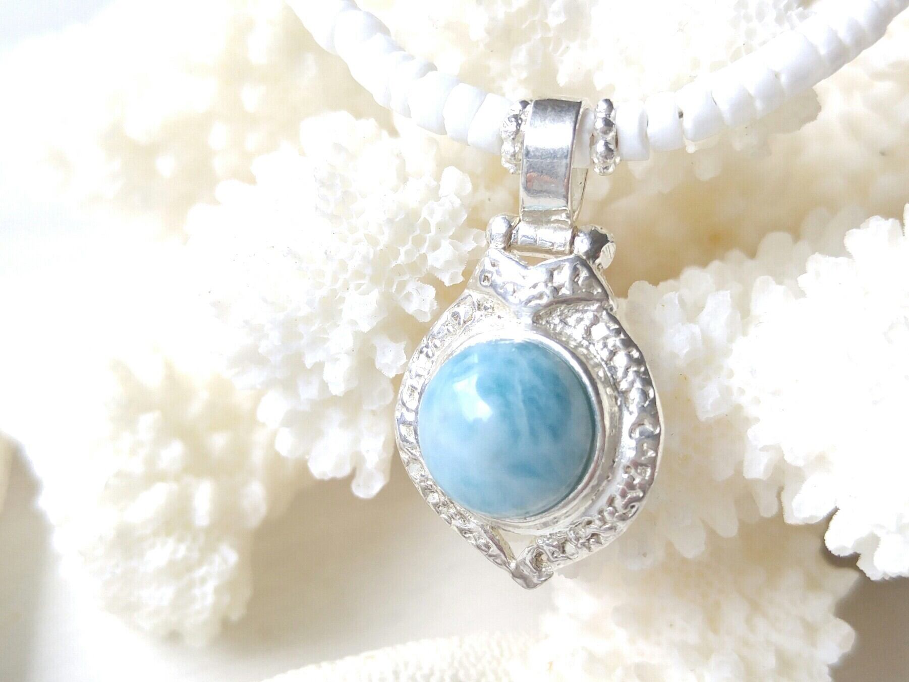 満月のような…ドミニカ共和国直輸入のまん丸美しいハイクオリティのラリマー、昔にHawaiiから持ち帰った私物シェルを使った