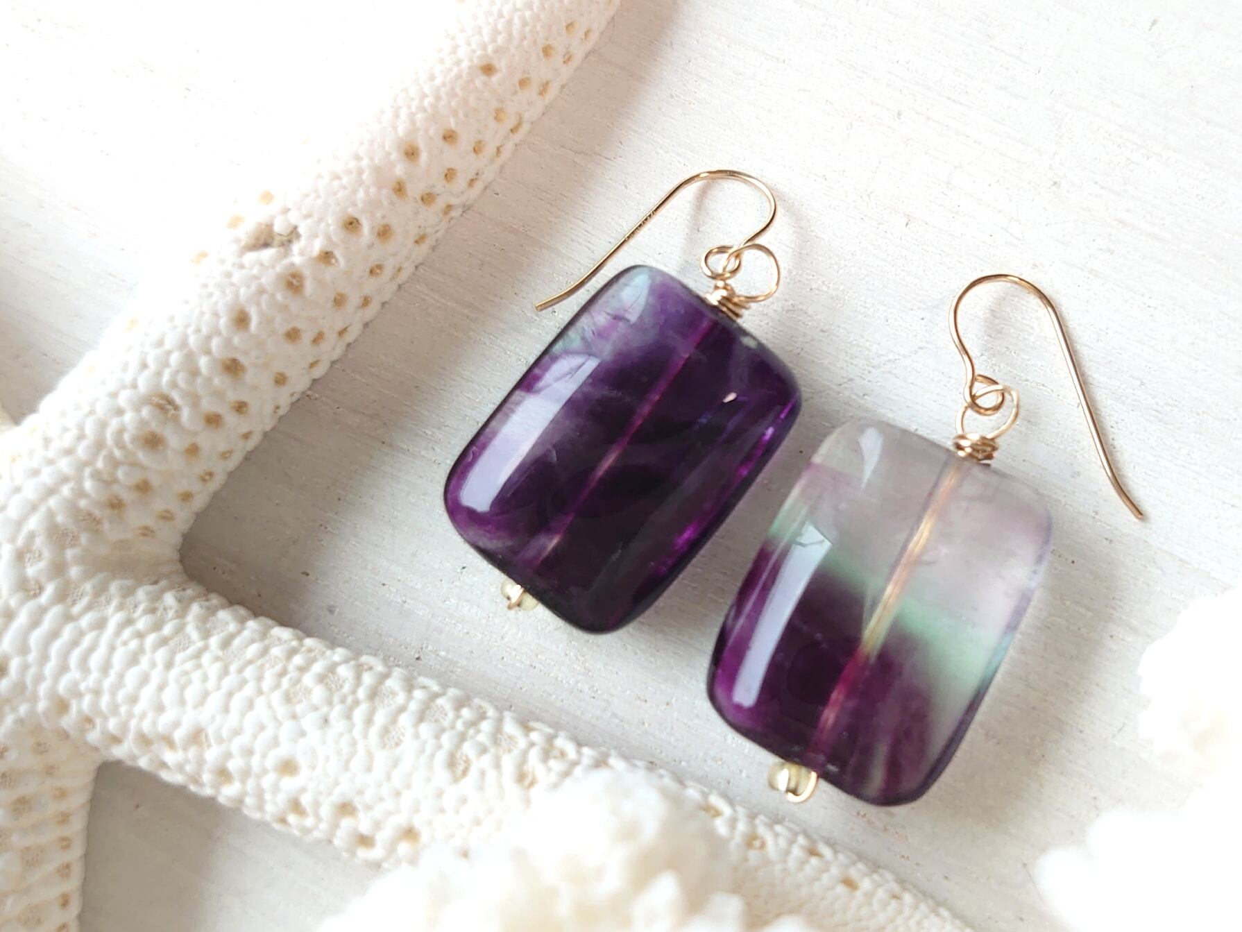 形がスタイリッシュ♪水の中にインクを落としたような模様が素敵!みずみずしくて大粒♪パープル&グリーンとパープルとクリアのトリカラーのフローライトを使った
