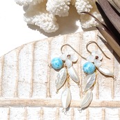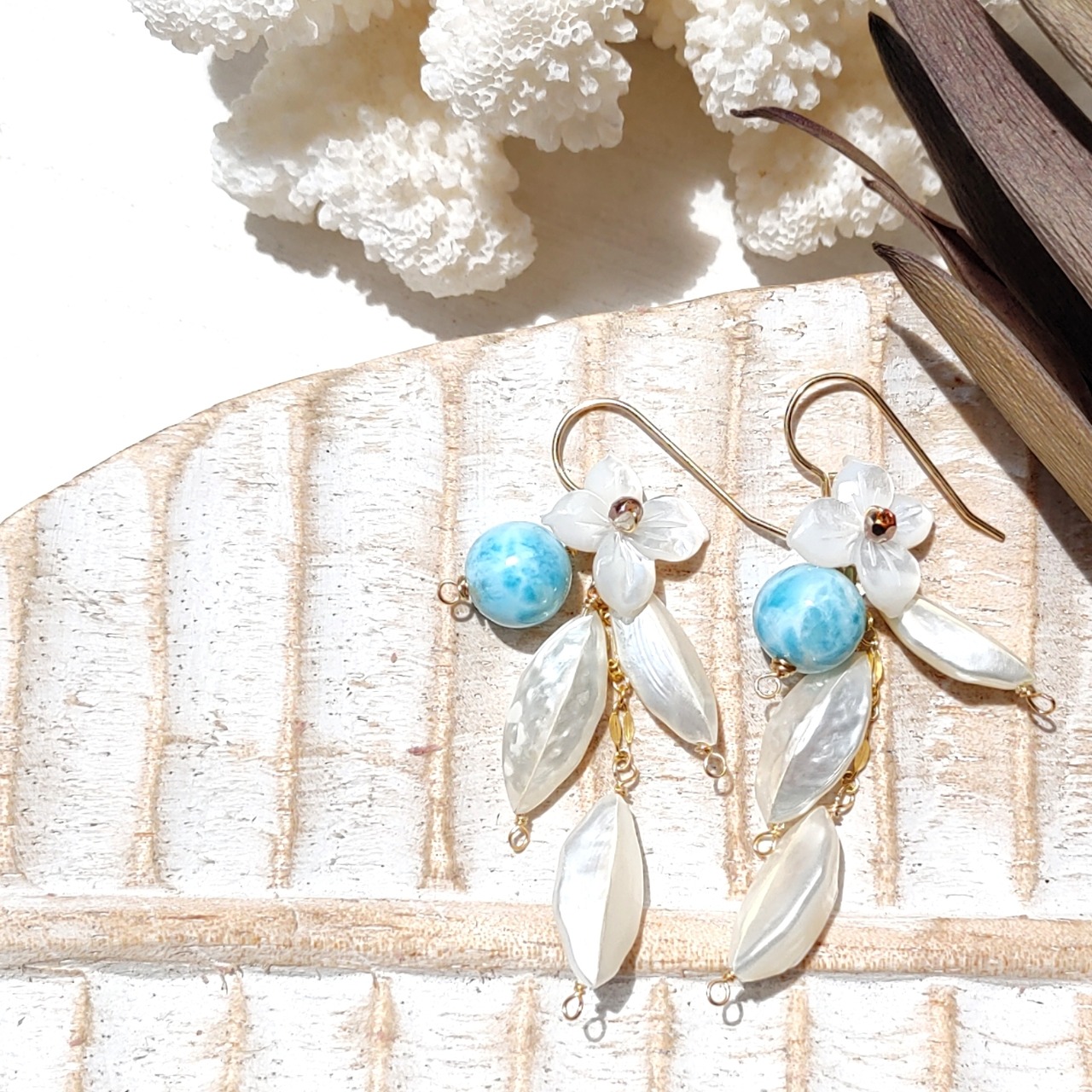 サプライズ!!♡海玉&海の音色の耳飾り14kgf♡-美しいハイクオリティ海玉ラリマー&ガーリックシェイプのシェル&ホワイトシェルの花