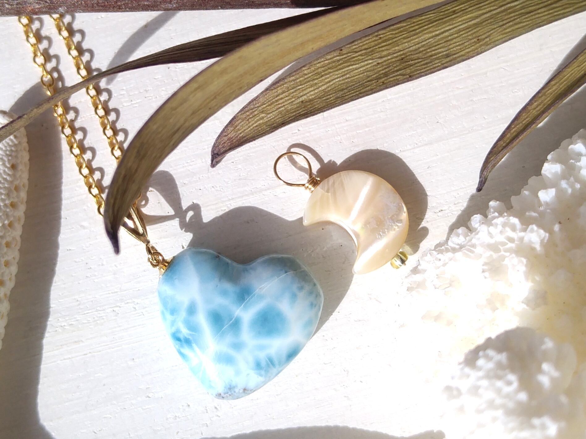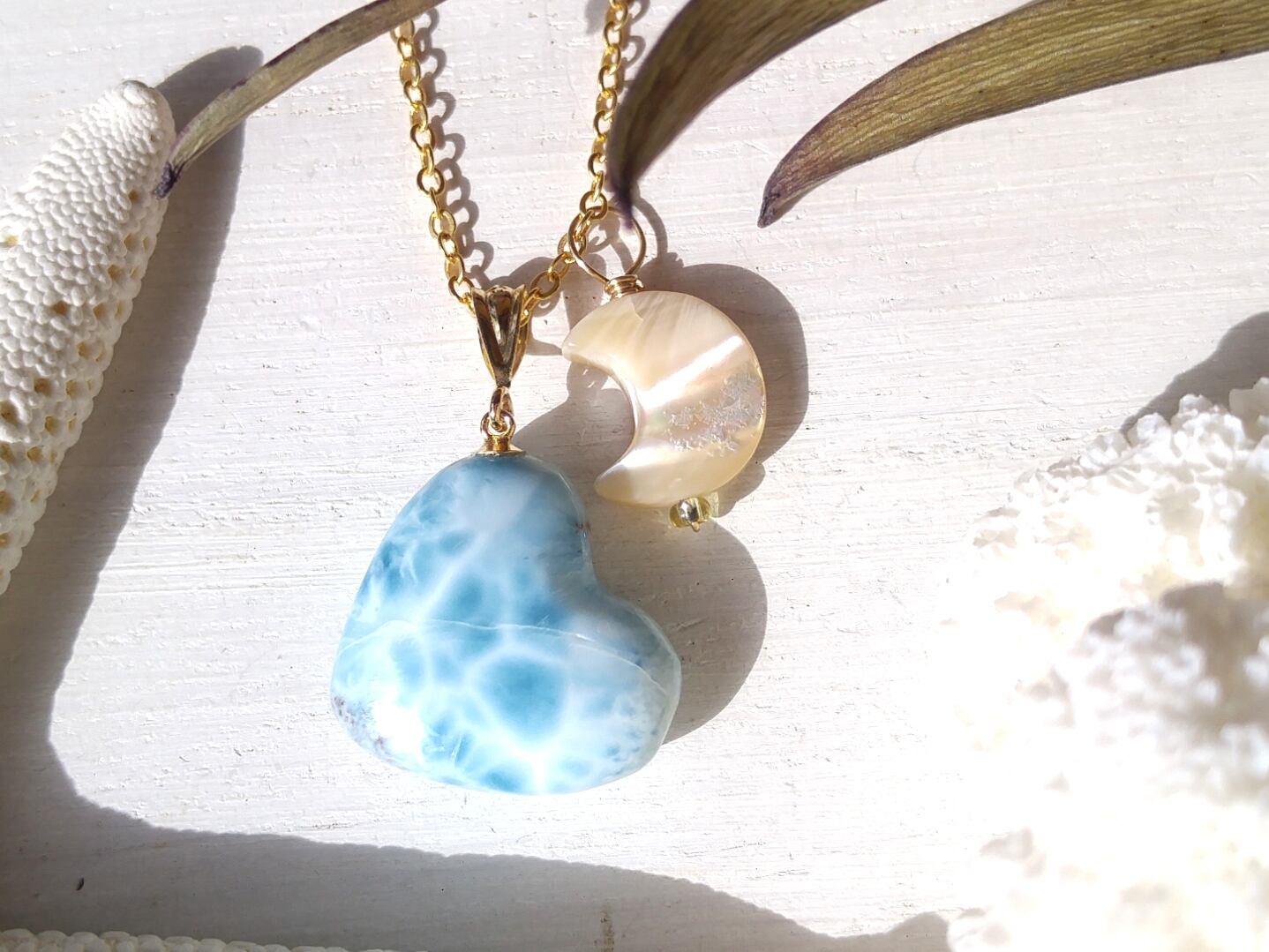 サプライズ!!♡Mermaid Heart♡14kgf−美しくて可愛いハートラリマー&ブラウンシェルムーンチャーム Cuteなネックレス−