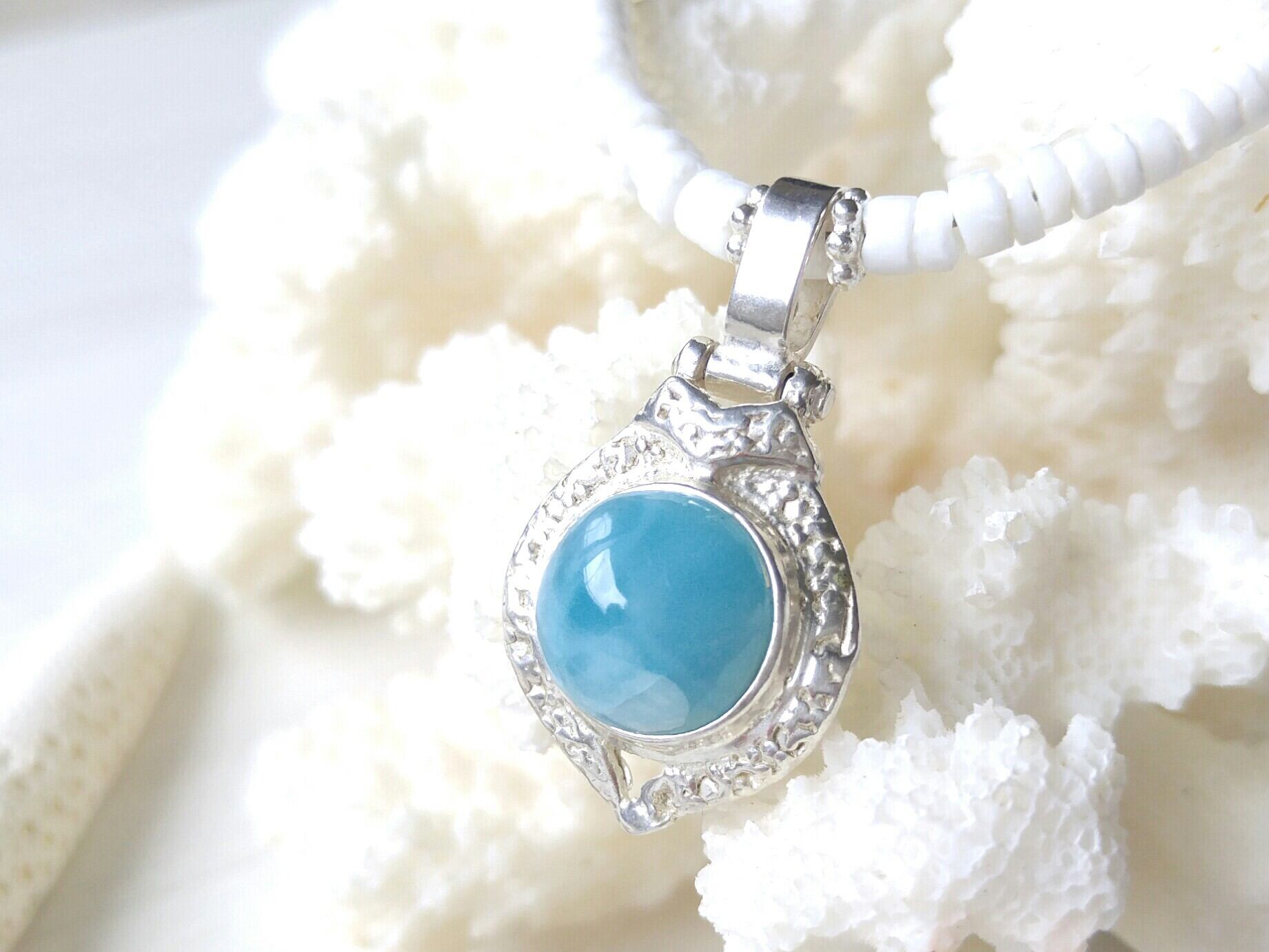 満月のような…ドミニカ共和国直輸入のまん丸美しい超ハイクオリティのラリマー、昔にHawaiiから持ち帰った私物シェルを使った