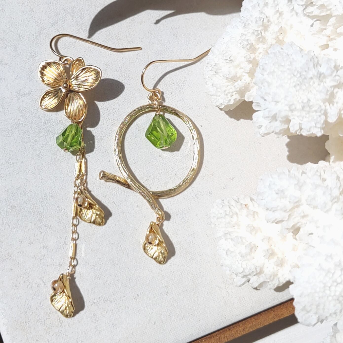 Leaf tear earrings 14kgf−ペリドット&インペリアルトパーズ 8月誕生石