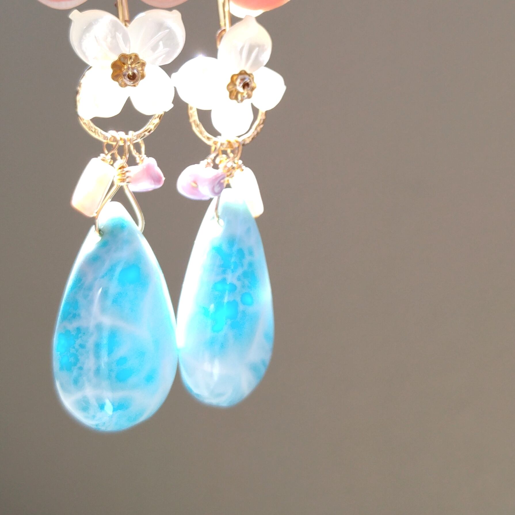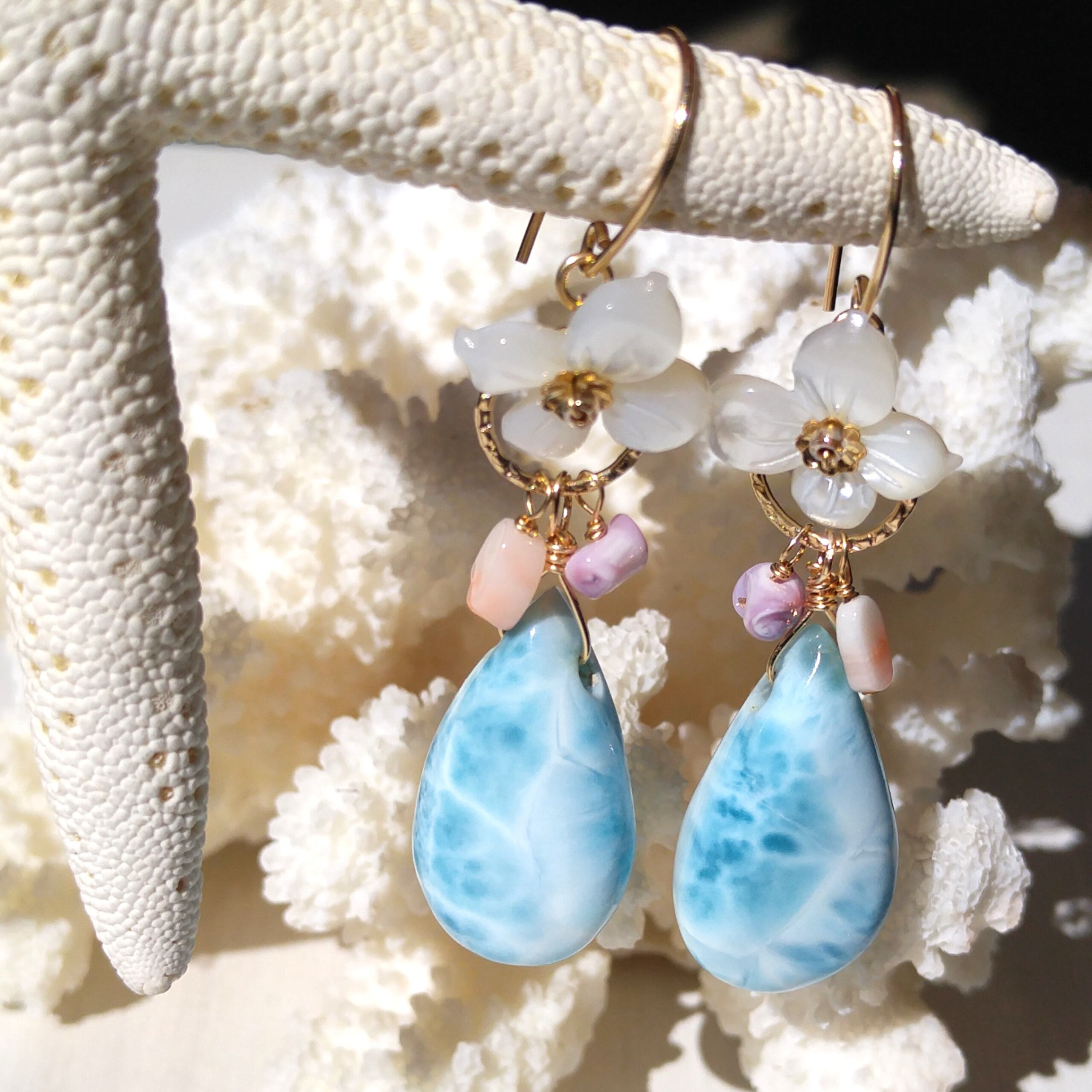 ♡海の花の耳飾り14kgf♡‐レア!可愛い双子の超ハイクオリティの雫ラリマー&白蝶貝の花など-
