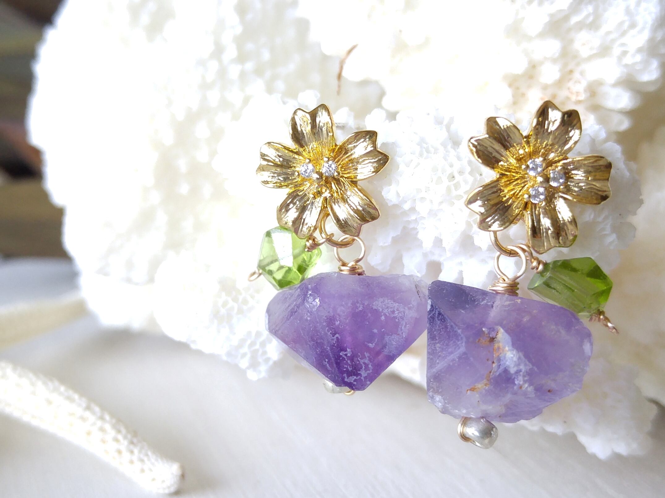 紫色が美しいアメジストの原石、春の若葉色が美しい宝石質ペリドット、ゴールドの可愛い花のピアスを使った