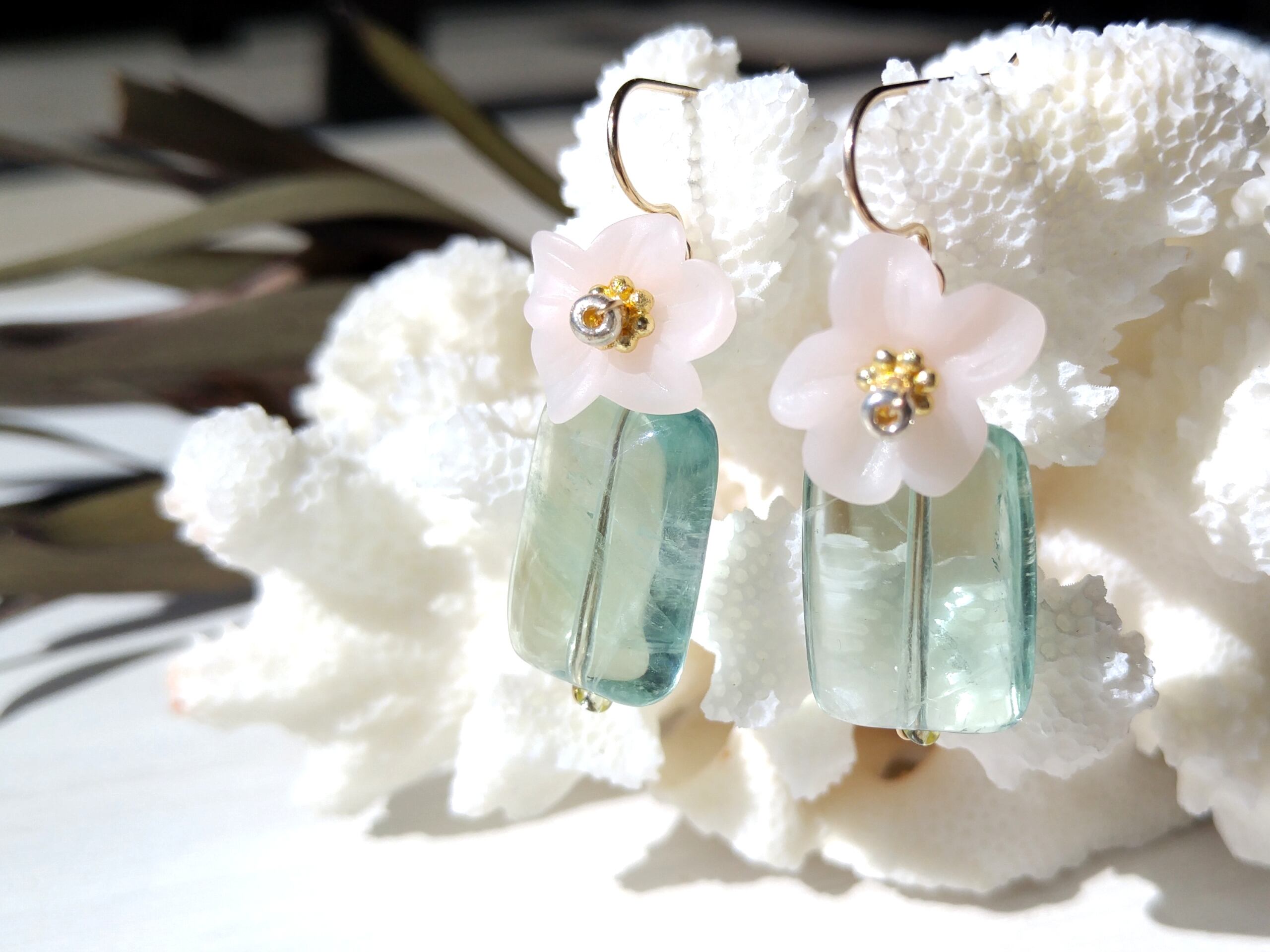 桜ピンクの花がフローライトのグリーンを際立たせて、珍しい組み合わせのピアスに仕上げました(*^^*)