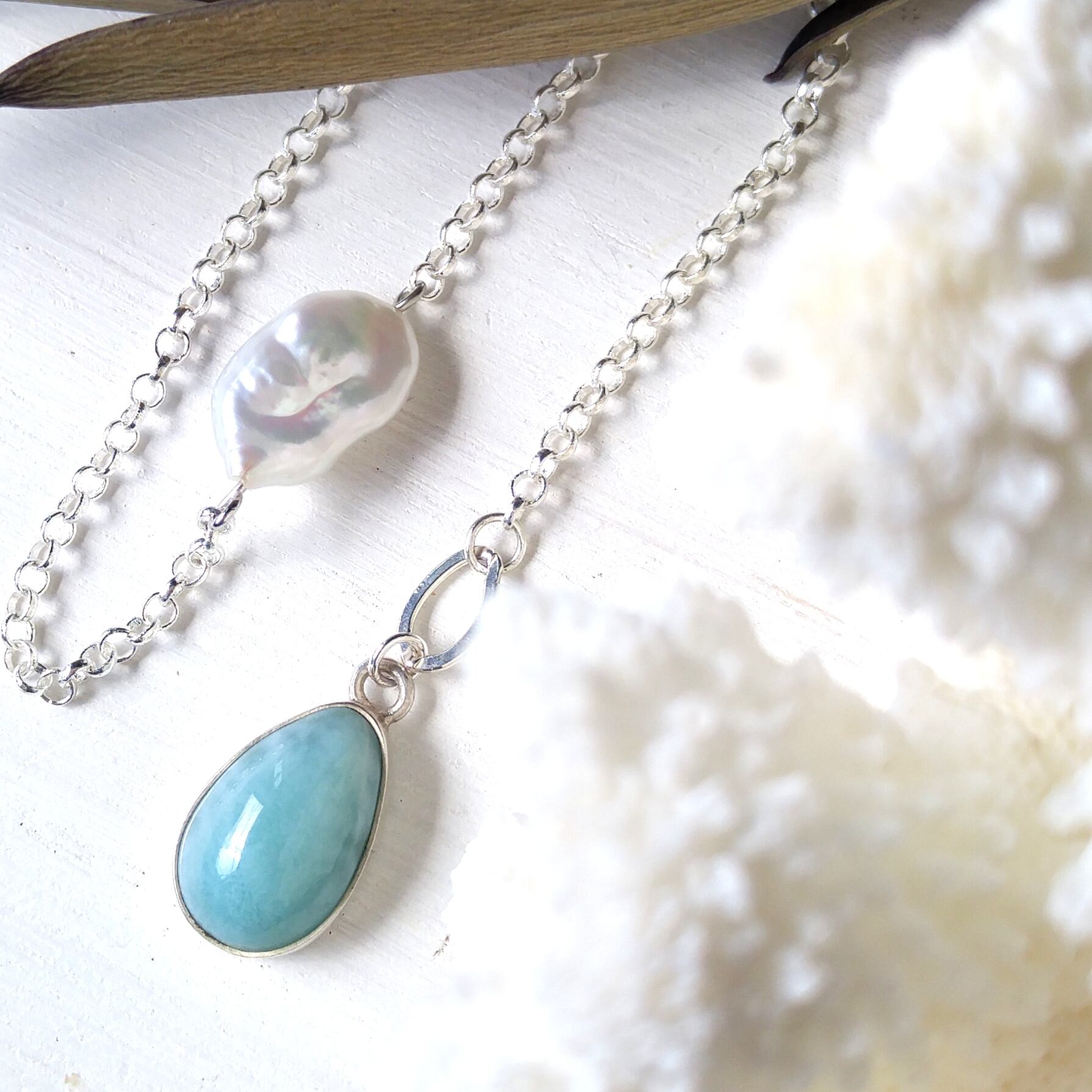 ドミニカ共和国直輸入の可愛い雫ラリマー、照りが美しい大粒バロックパールを使った