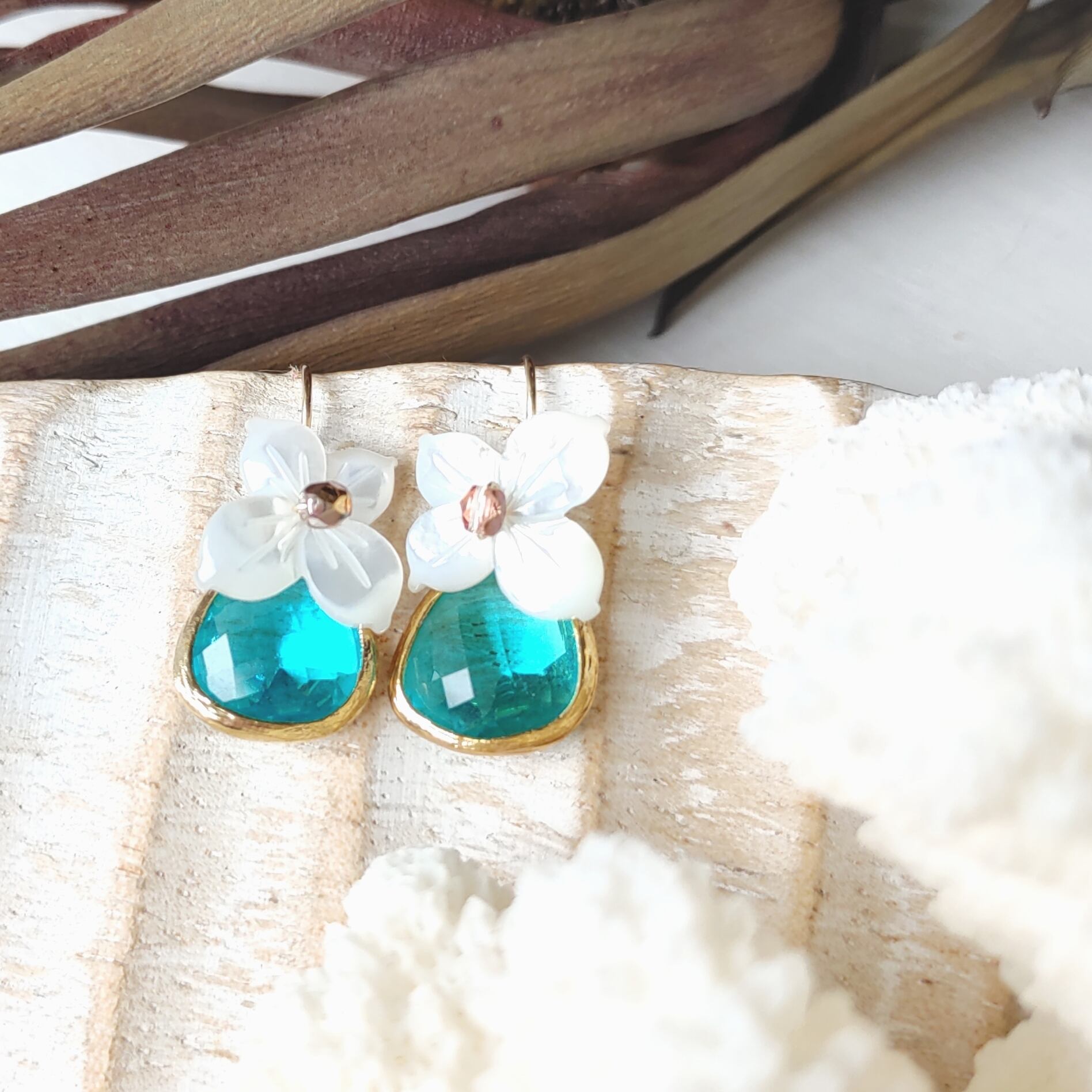 ♡Summer flower(14kgf)♡ーキラキラ♪ブルージルコンのフレームドグラス&ホワイトシェルの花 パッと目を引く大人可愛いピアス