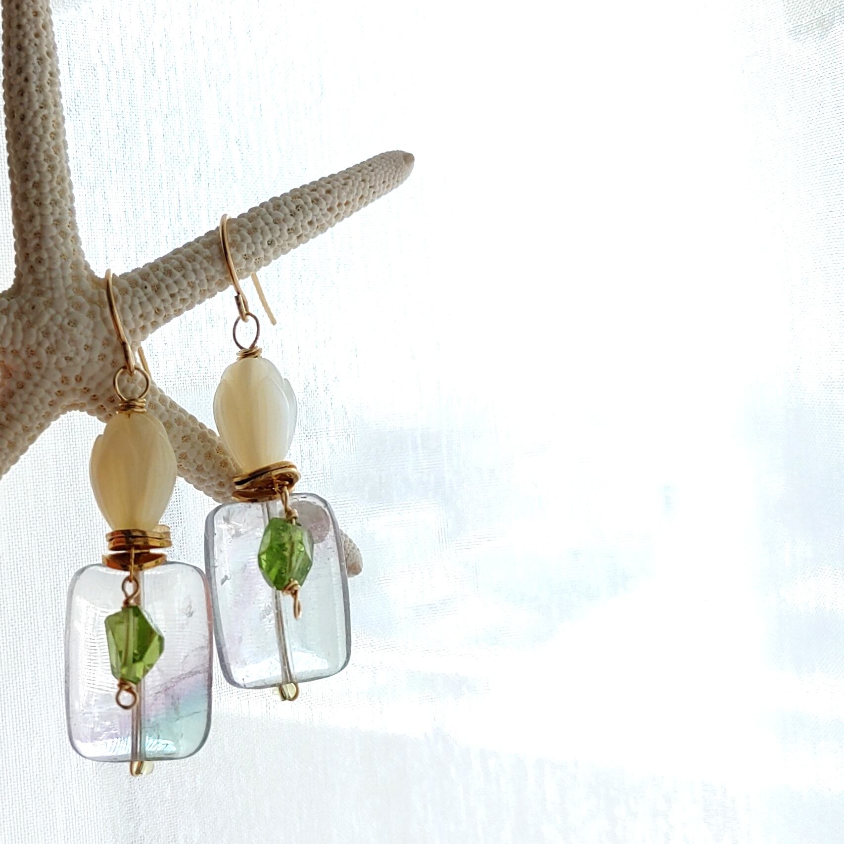 透明の中にパープルピンク&グリーンが虹のように入った可憐で美しいレインボーカラーのみずみずしい大粒フローライト♪、マザーオブパールの花の蕾、みずみずしく美しい宝石質ペリドットを贅沢に使った