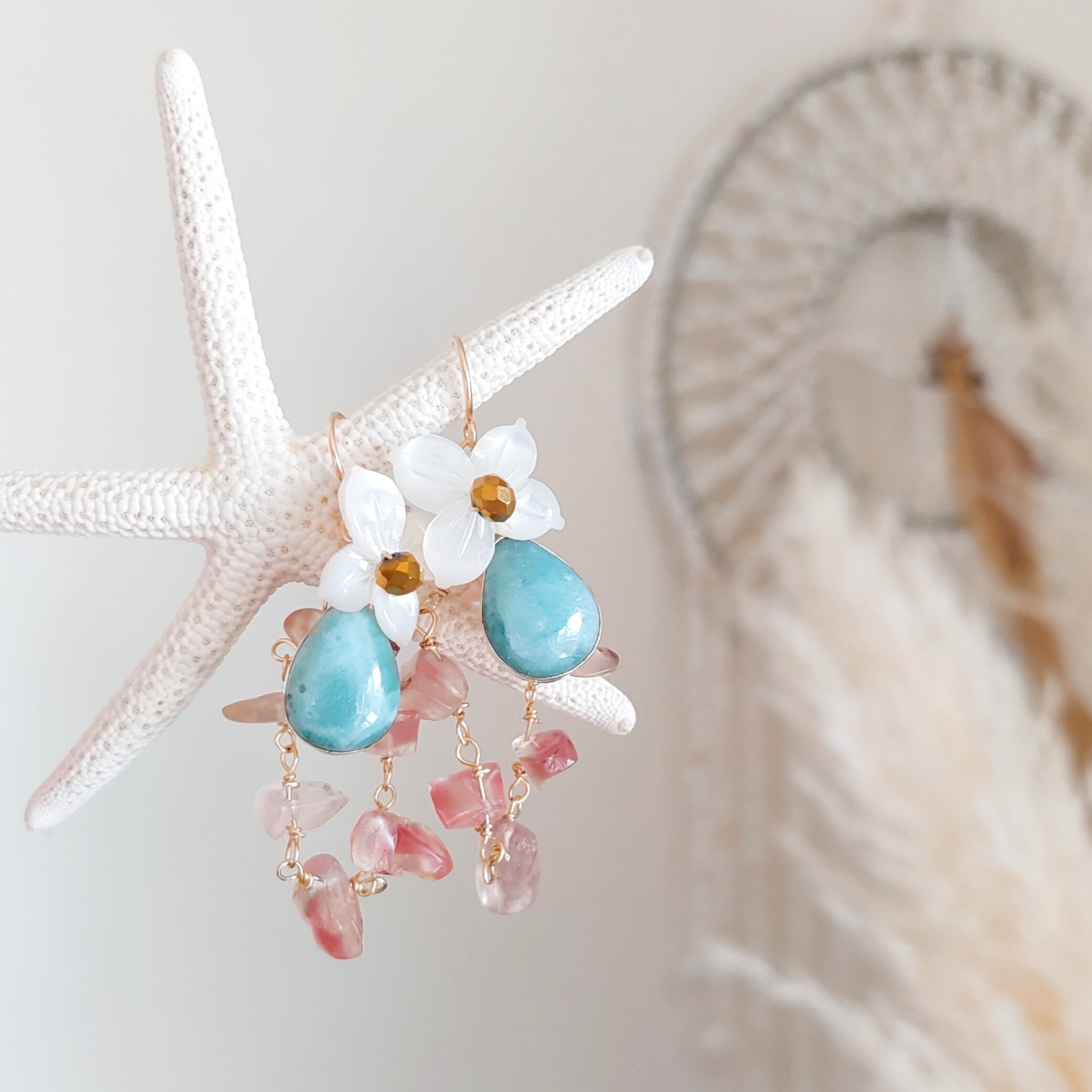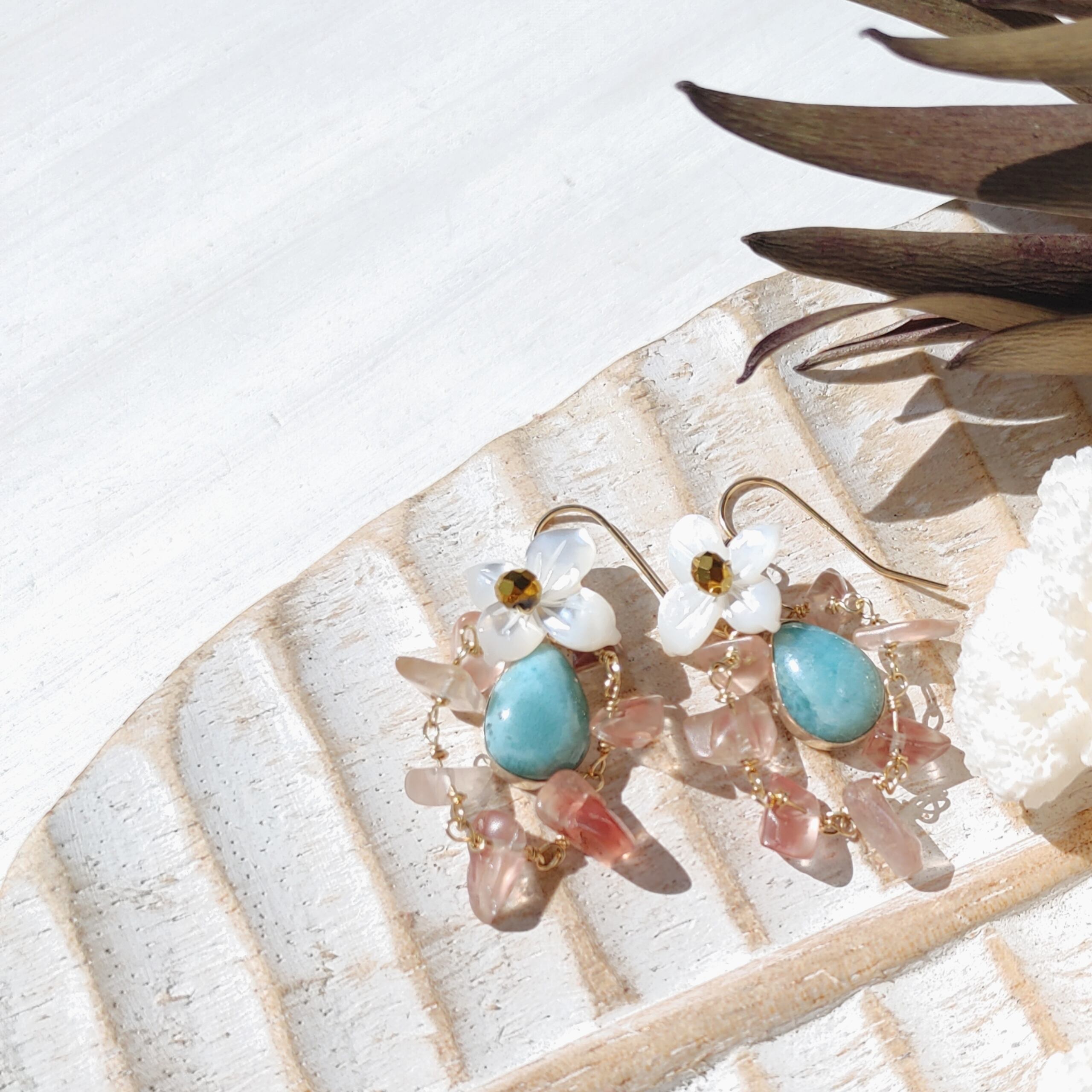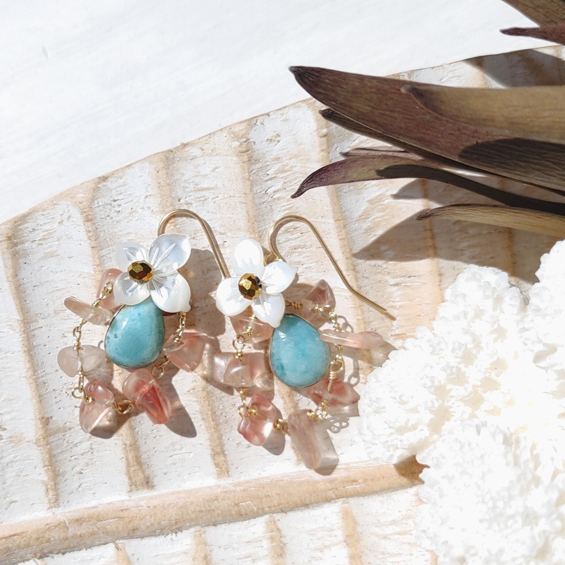 空の雫のようなドミニカ共和国直輸入の可愛い雫ラリマー、アプリコット色の甘い蜂蜜のような貴重なオレゴンサンストーン、艶が美しい可愛いシェルの花を使った
