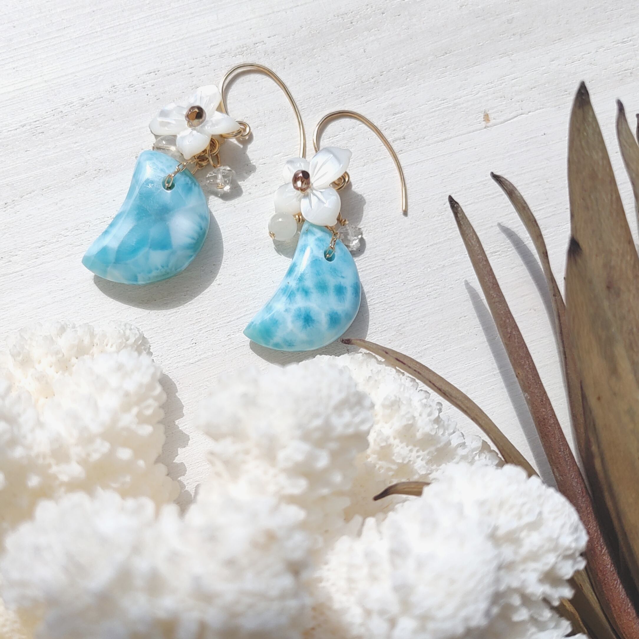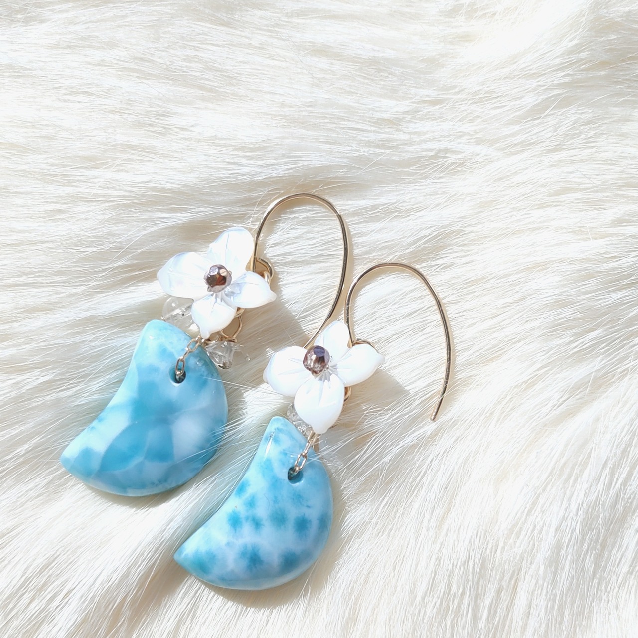 Sold ☾☾ Flower moon earrings 14kgf No.1 ☾☾ 美しいお月様ラリマーのピアス