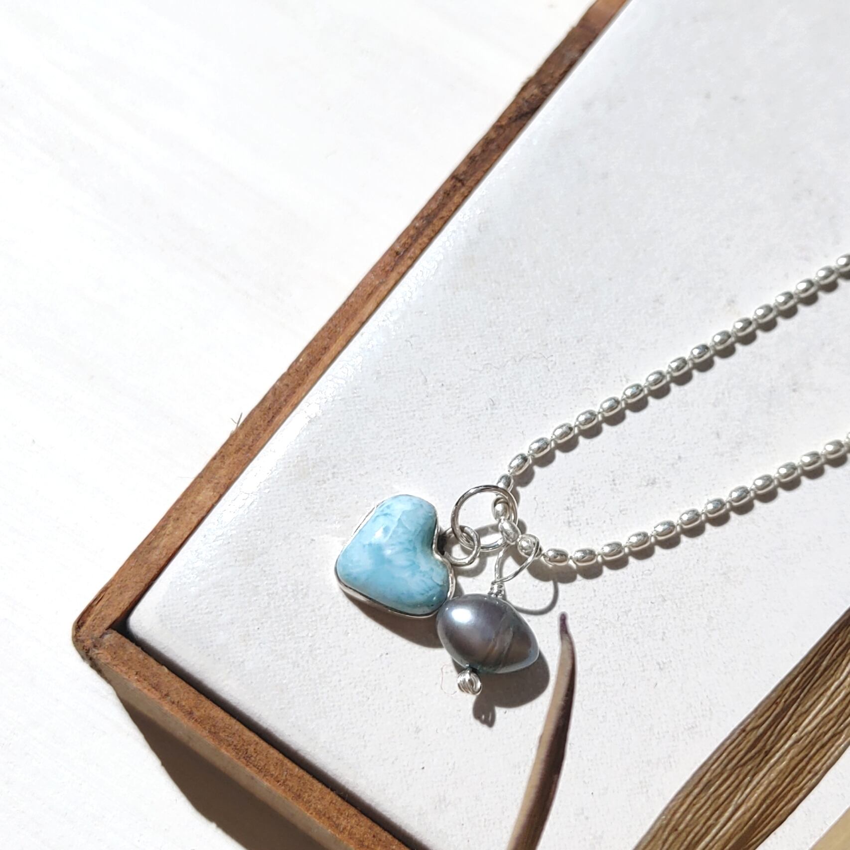 ドミニカ共和国直輸入の可愛いプチサイズのハートラリマー、タヒチアンパール、ぷちぷちのイタリタンボールチェーンを使った