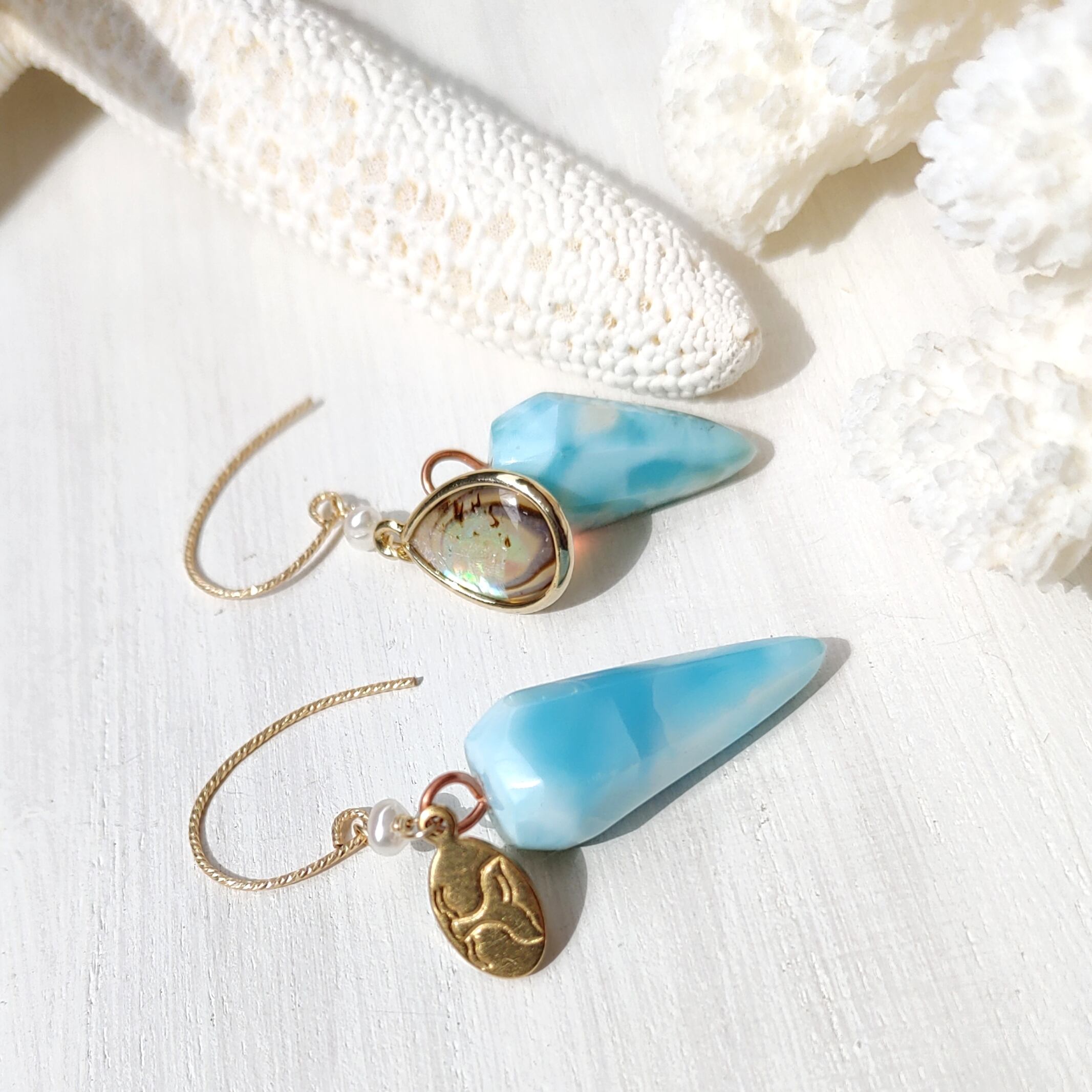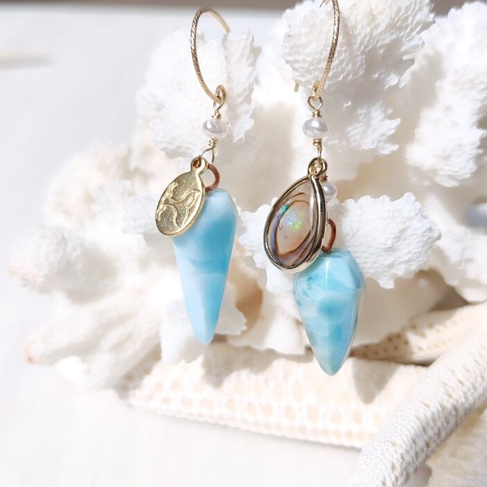 ドミニカ共和国直輸のレアなポイントシェイプのペンデュラムの形ががカッコいいラリマー、淡水パール、パウアシェル、ロゴタグを使った