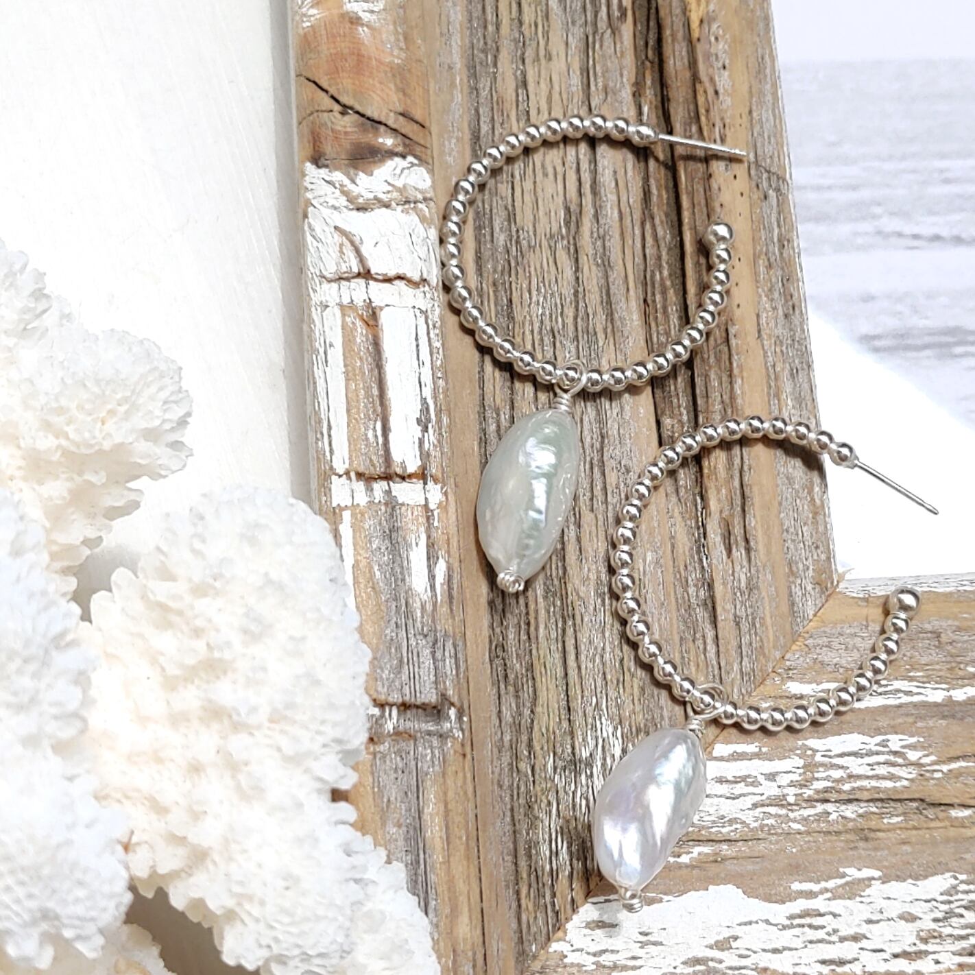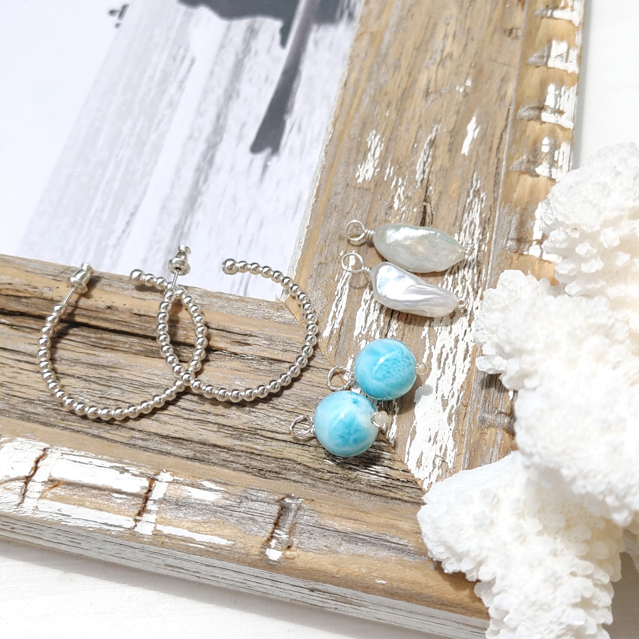 美しい海玉のような超トップクオリティラリマー、艶が美しい大粒バロック淡水パール、泡をイメージした大きめフープピアスを使って、