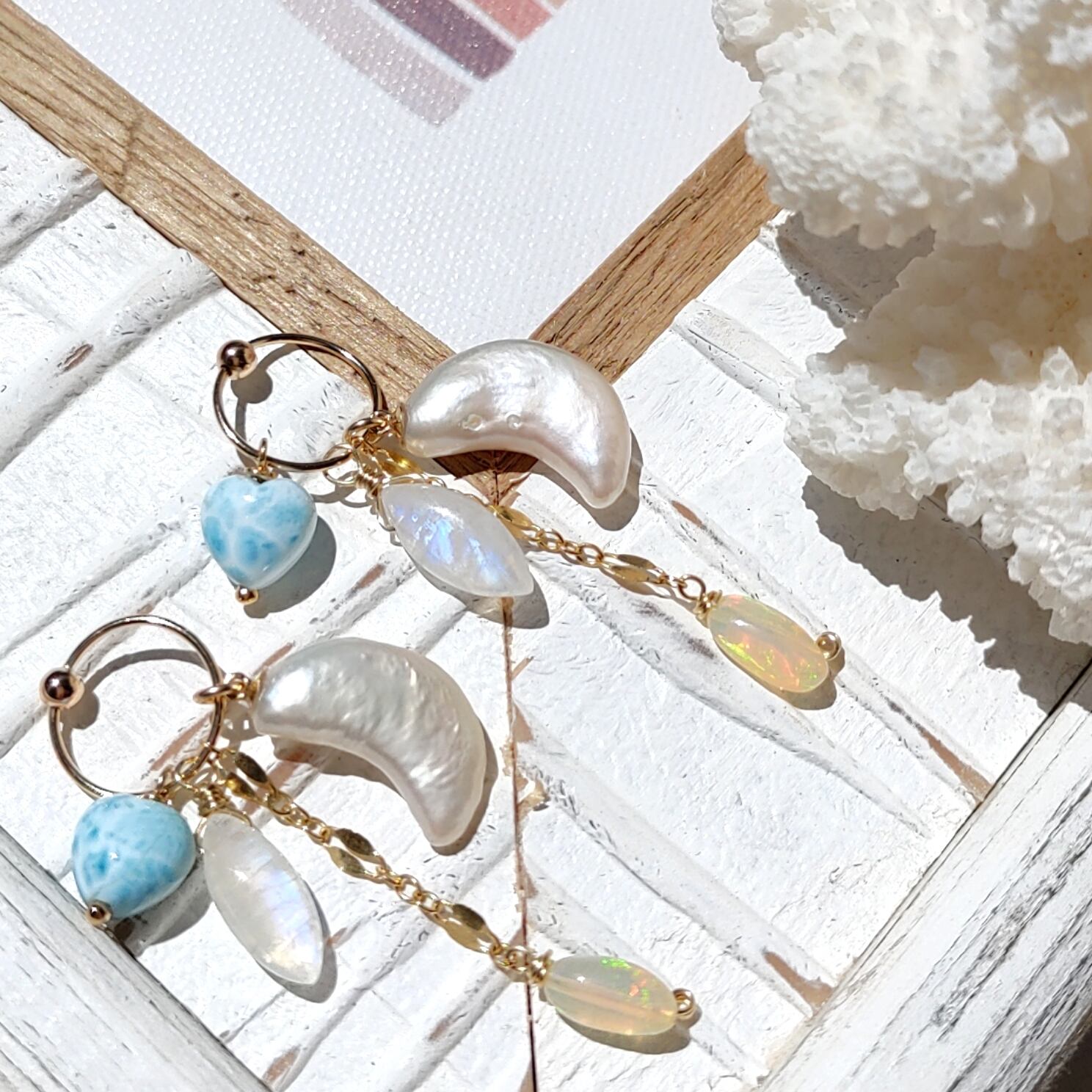 お月様の形が可愛い淡水パール、レッセンスが美しいレインボームーンストーン、キラキラはっきり煌めきが美しいプレシャスオパール、