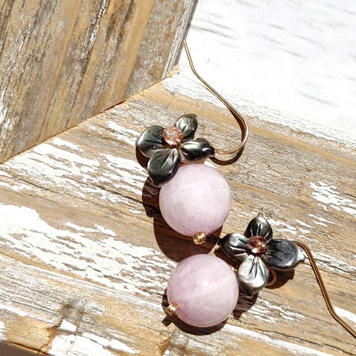 ベビーピンクが物凄く可愛い貴重な大粒ナイジェリア産クンツァイトを2珠、ブラックシェルのフラワーを使った