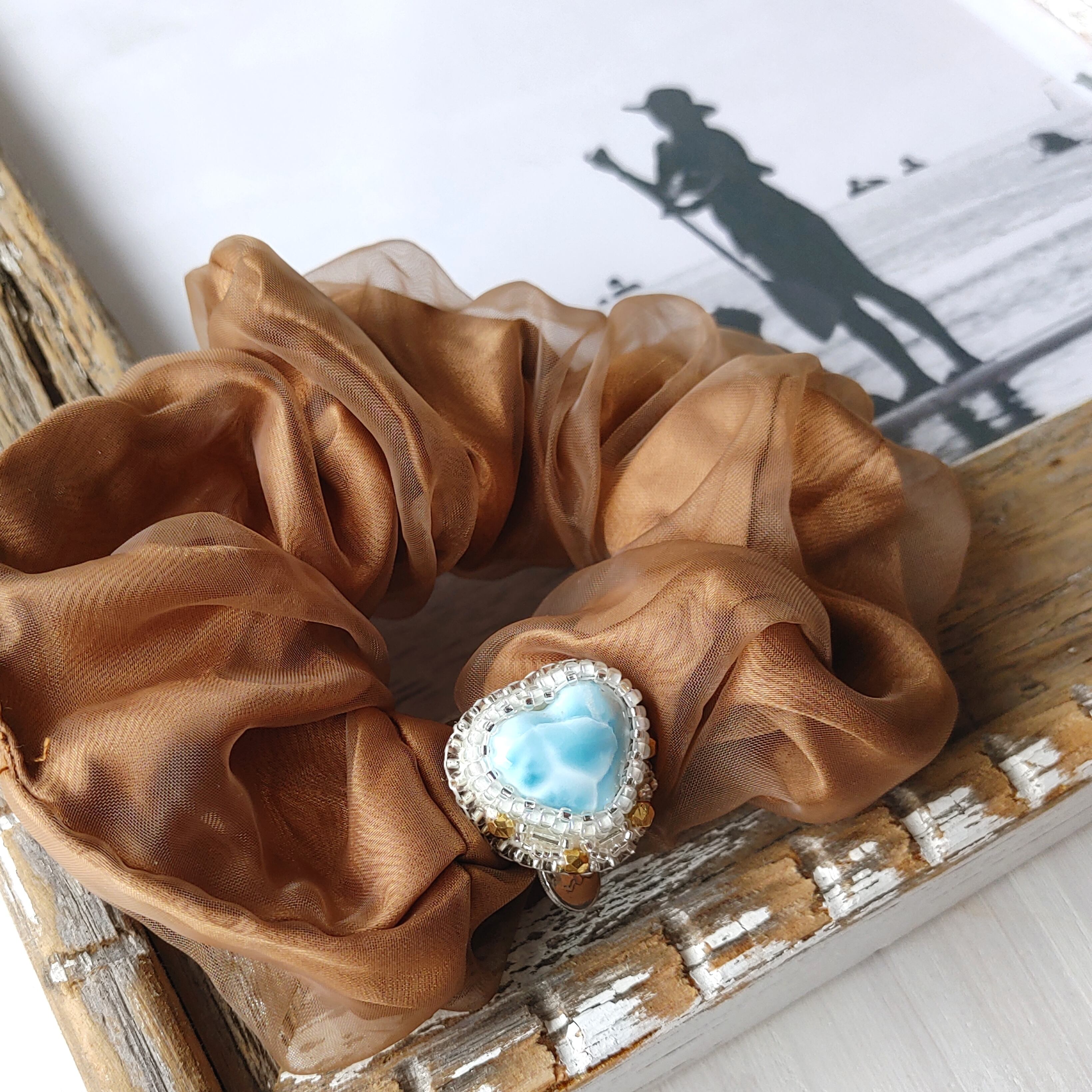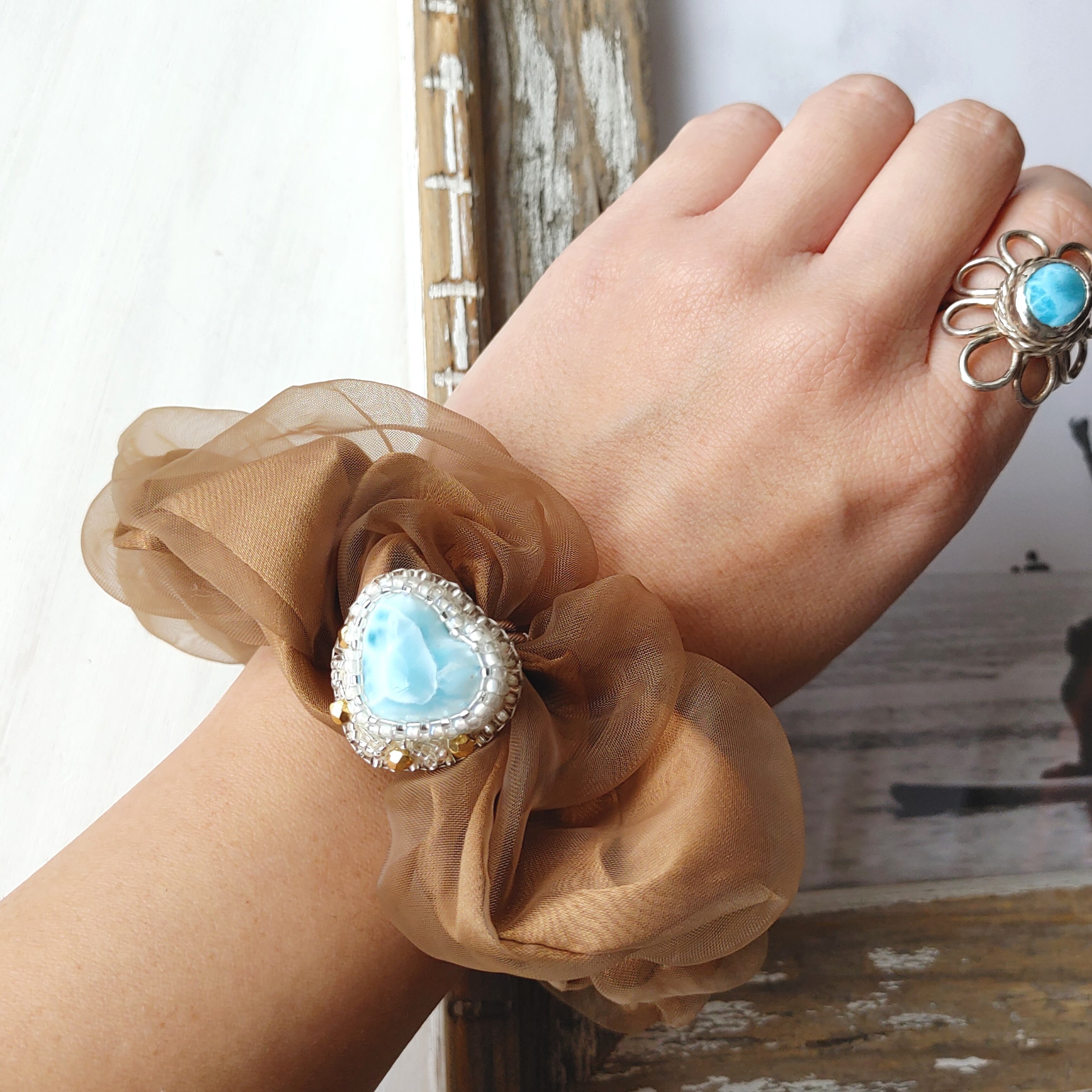 ビーズ刺繍のハートラリマーのコンチョを引き立たせるために、たくさん悩んだ結果、手作りしたブラウンのシュシュを合わせました。