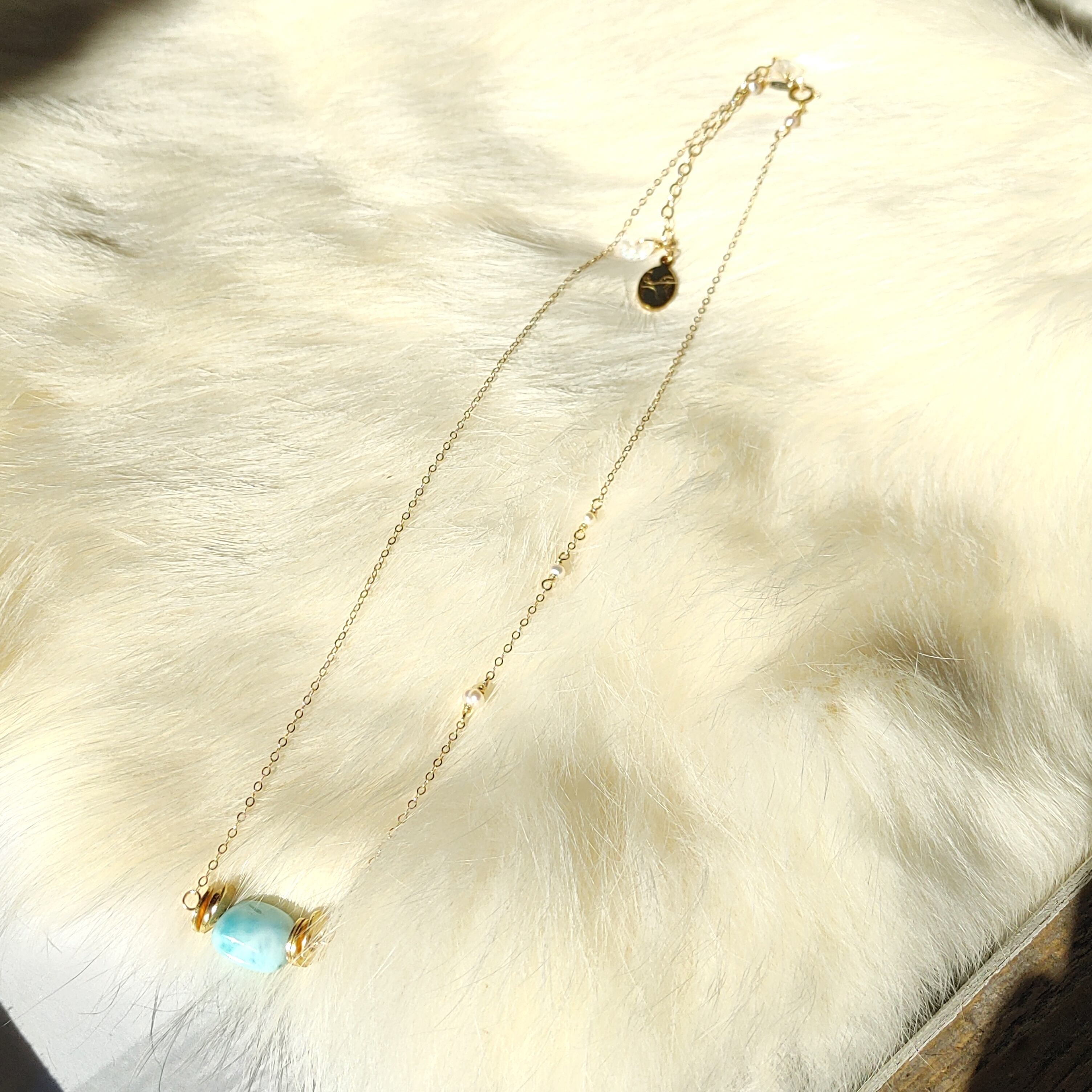 チェーンの途中には淡水パールを散りばめて、アジャスターのところにはレインボームーンストーンをプラスして♪