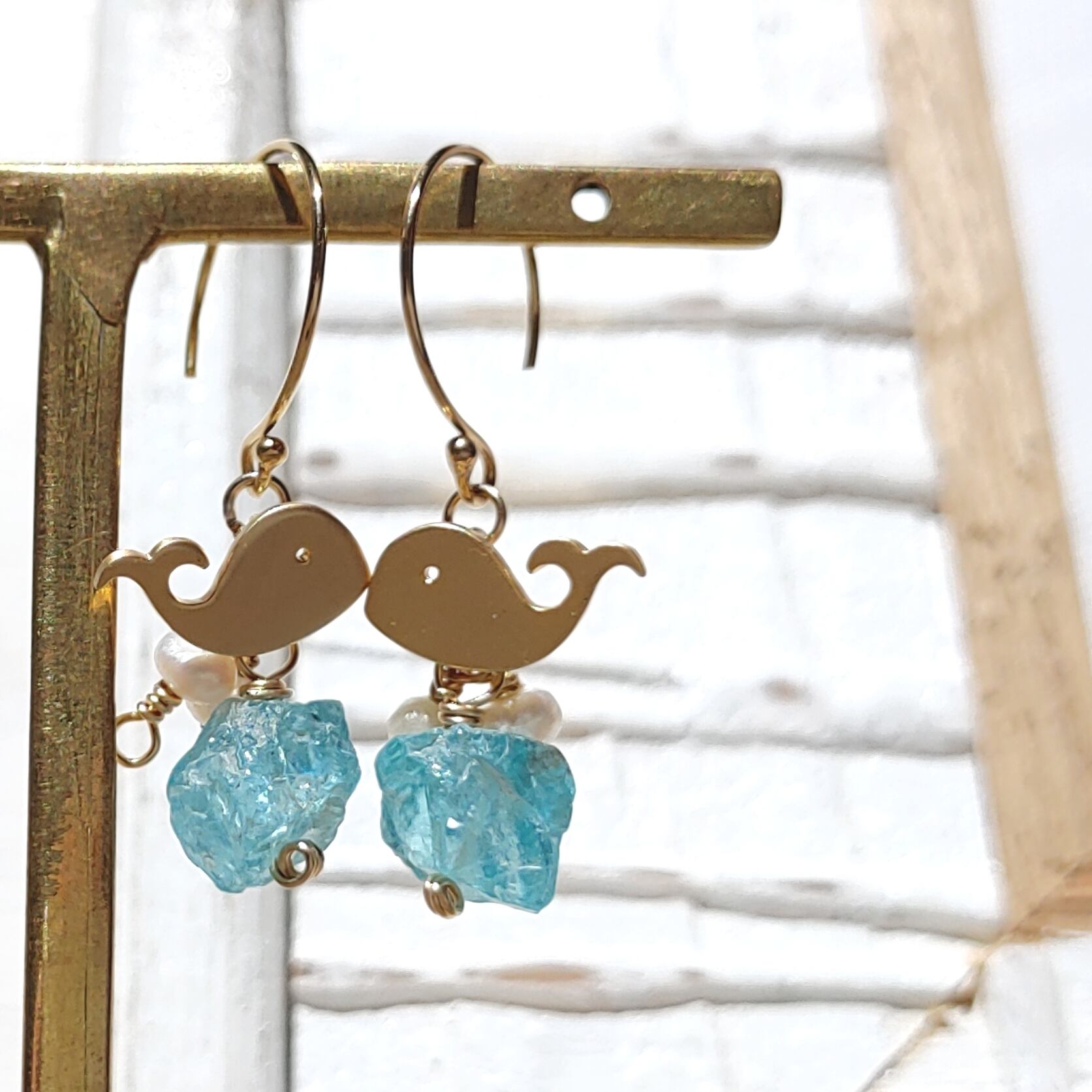 マットゴールドの可愛いくじら、鮮やかなアパタイト原石、艶が綺麗な淡水パールを使った