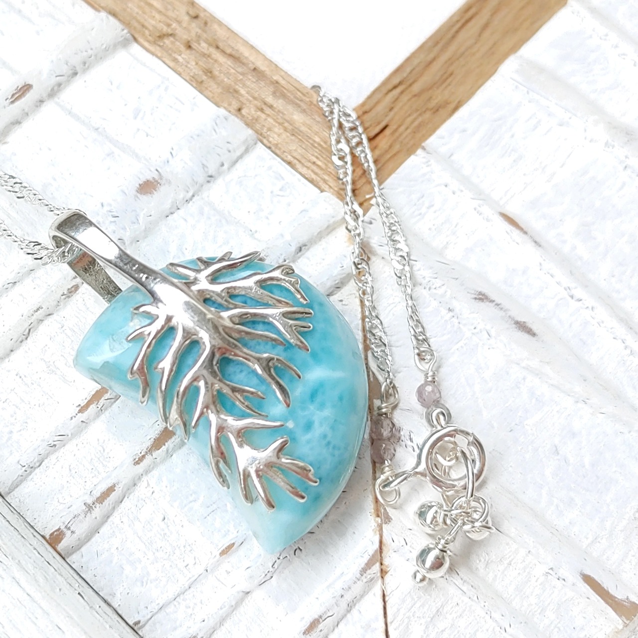 胸もとで揺れて遠目からもパッと目立つ存在感いっぱいの超ハイクオリティのラリマー